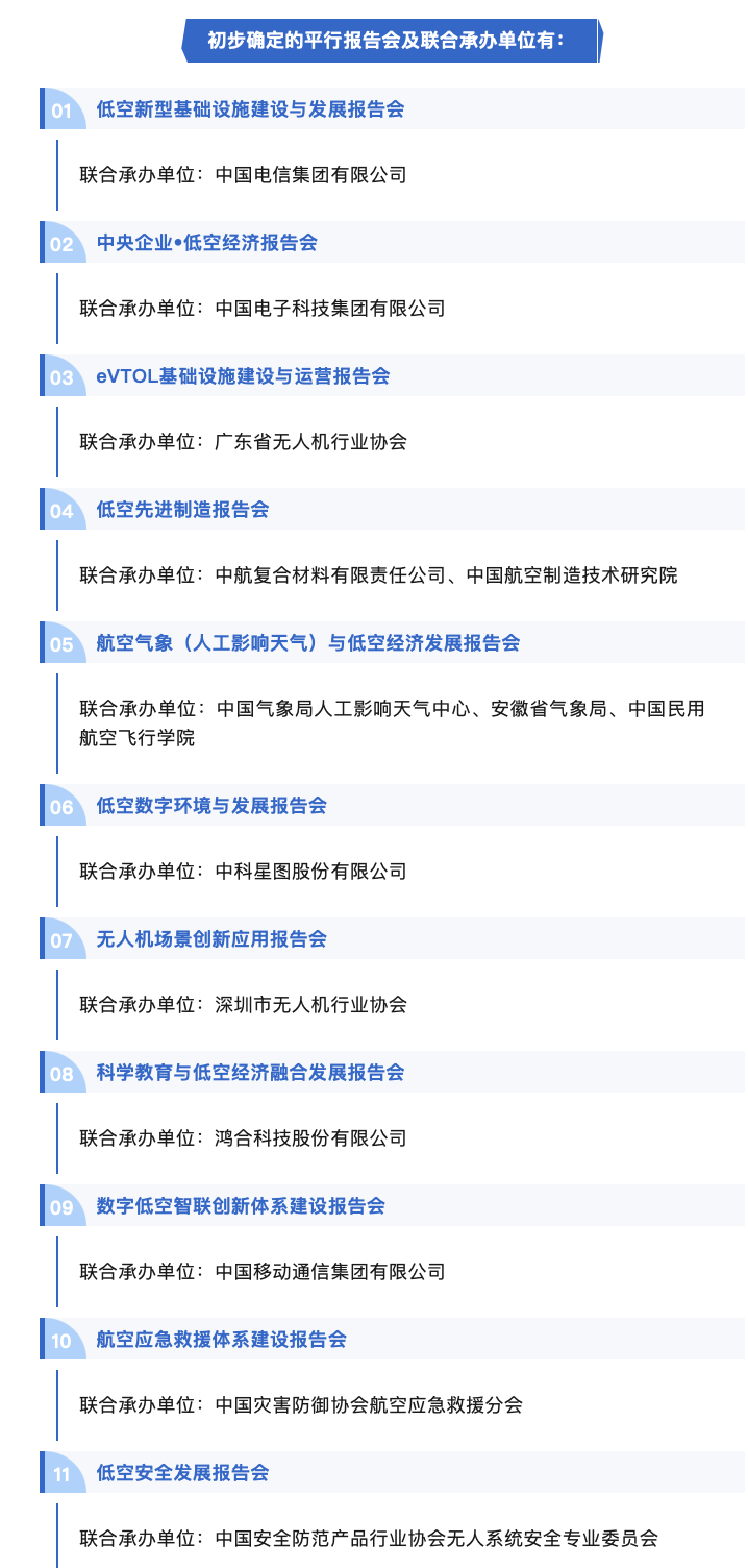 e公司讯,中交协低空交通经济专委会今日官微消息,为加速推进低空经济新质生产力的形成,安徽省人民政府将于9月6日—8日在芜湖举办2024低空经济发展大会。本届大会是低空经济列为新质生产力重要引擎之后举办的首次行业盛会,将设立会议、展览、演练、发布等板块。其间还将举办一系列成果发布、项目签约、场景演练等活动,进一步凝聚低空经济发展创新要素。根据各单位申报情况并经研究讨论,初步确定了本次大会将举办的十一场平行报告会。其中,中国电信集团将联合承办“低空新型基础设施建设与发展报告会”;中国电子科技集团将承办“中央企业·低空经济报告会”;鸿合科技将承办“科学教育与低空经济融合发展报告会”;中国移动通信集团将承办“数字低空智联创新体系建设报告会”等。