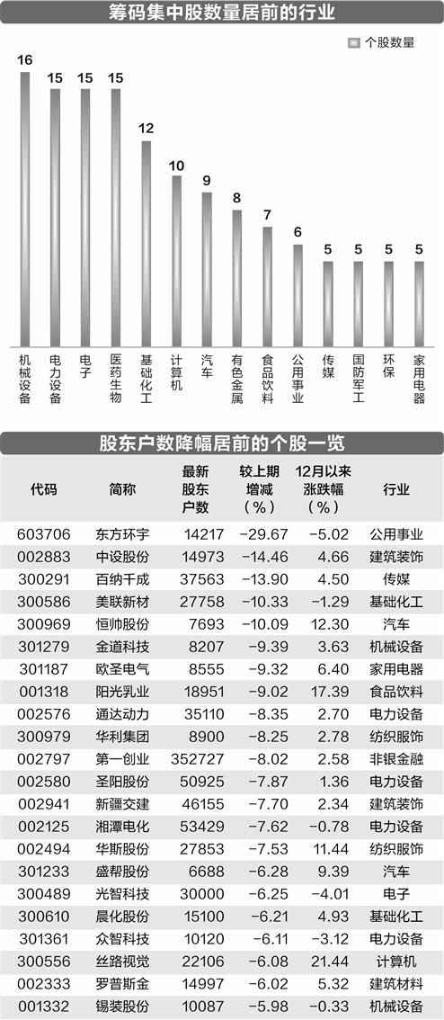 e公司讯,据证券时报·数据宝统计,截至12月12日,300只个股披露了最新一期股东户数,与上期(11月30日)相比,股东户数下降的个股有162只。具体来看,29只个股股东户数下降幅度超过5%,5只个股下降幅度超过10%,包括东方环宇、中设股份、百纳千成、美联新材、恒帅股份。多只筹码集中股近期行情表现较好。据数据宝统计,126只筹码集中股本月以来平均上涨4.86%,18只个股累计涨幅在10%以上,涨幅居前的有国安达、北纬科技、丝路视觉,分别上涨42.5%、26.18%、21.44%。从行业上来看,筹码集中股在机械设备、电力设备、电子、医药生物四大行业数量最多。