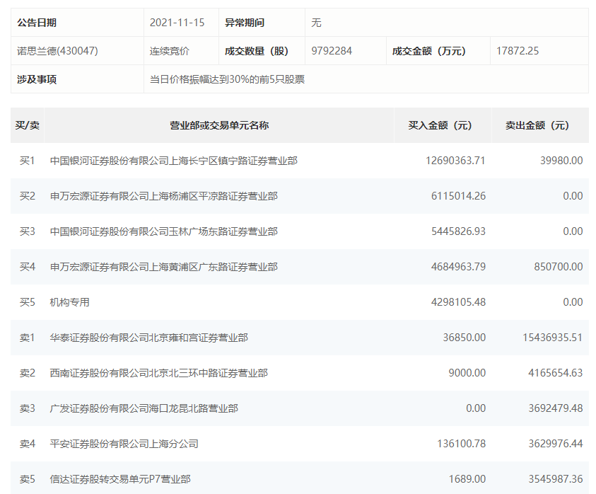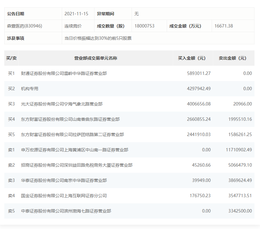 e公司讯,北交所公司首日龙虎榜:诺思兰德(430047)今日跌逾6%,机构买入429万元,银河证券股份有限公司上海长宁区镇宁路证券营业部买入1269万元;森萱医药(830946)跌近8%,机构买入429万元,财通证券股份有限公司温岭中华路证券营业部买入589万元。