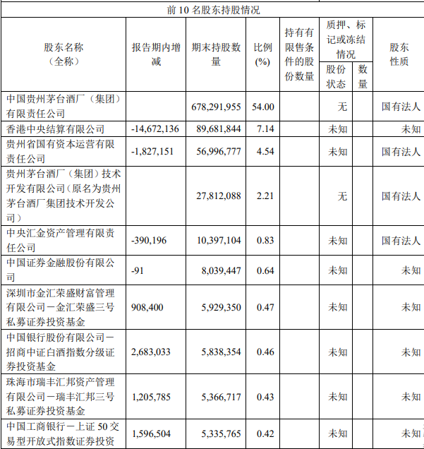 e公司讯,贵州茅台3月31日披露2021年年报,股东持股方面,前十大股东名单基本没变,不过持股数量略有变化。具体来看,香港中央结算有限公司略有增持,持股7.14%,上期为7.05%。两私募基金也有增持,金汇荣盛三号私募证券投资基金略有增持,持股比例0.47%,上期为0.45%;瑞丰汇邦三号私募证券投资基金也略有增持,从0.41%增持至0.43%。中央汇金资产管理有限责任公司持股比例略有下降,为0.83%,上期为0.86%;中国证券金融股份有限公司持股基本不变,仍为0.64%;招商中证白酒指数分级证券投资基金减持力度相对较大,从0.59%降至0.46%。