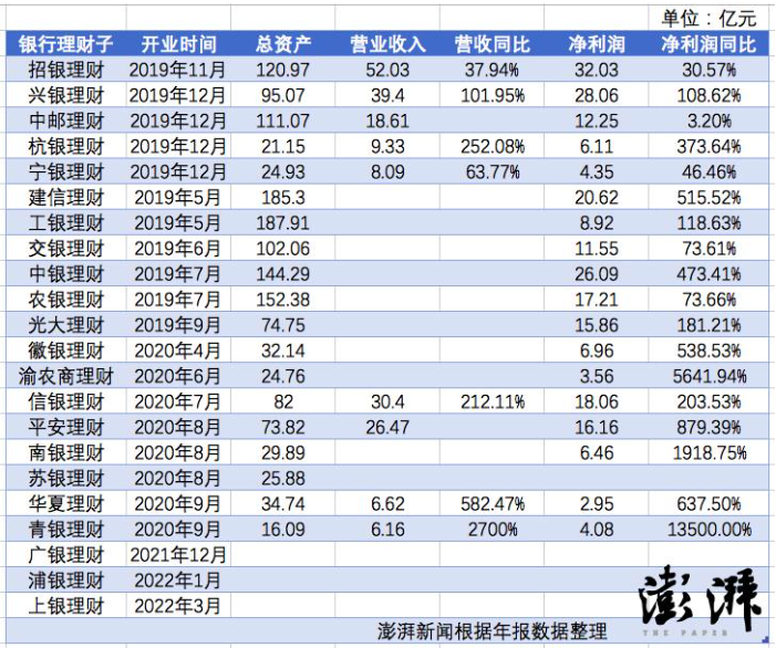 e公司讯,随着今年浦银理财、上银理财获批开业,目前已经开业的中资控股的理财子公司共22家。数据具备可比性的11家银行理财子公司中,净利润增幅第一的为建设银行理财子公司建信理财,高达515.52%。从已披露数据的银行子公司去年净利润额度来看,招商银行理财子公司招银理财2021年的净利润列第一,为32.03亿元。