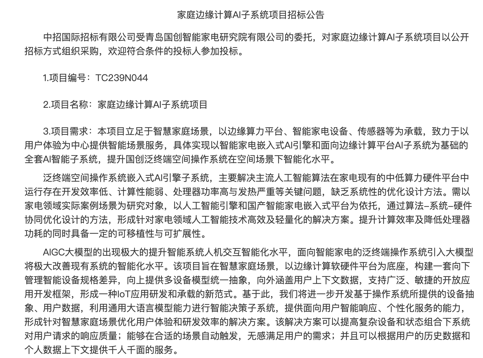 e公司讯,中国政府采购网今日发布《青岛国创智能家电研究院有限公司家庭边缘计算AI子系统项目公开招标公告》:中招国际招标受青岛国创智能家电研究院的委托,对家庭边缘计算AI子系统项目以公开招标方式组织采购。项目立足于智慧家庭场景,以边缘算力平台、智能家电设备、传感器等为承载,致力于以用户体验为中心提供智能场景服务,具体实现以智能家电嵌入式AI引擎和面向边缘计算平台AI子系统为基础的全套AI智能子系统,提升国创泛终端空间操作系统在空间场景下智能化水平。资料显示,青岛国创智能家电研究院由海尔联合中国家电院、中国电科院以及行业龙头企业和上下游合作伙伴等共同发起。