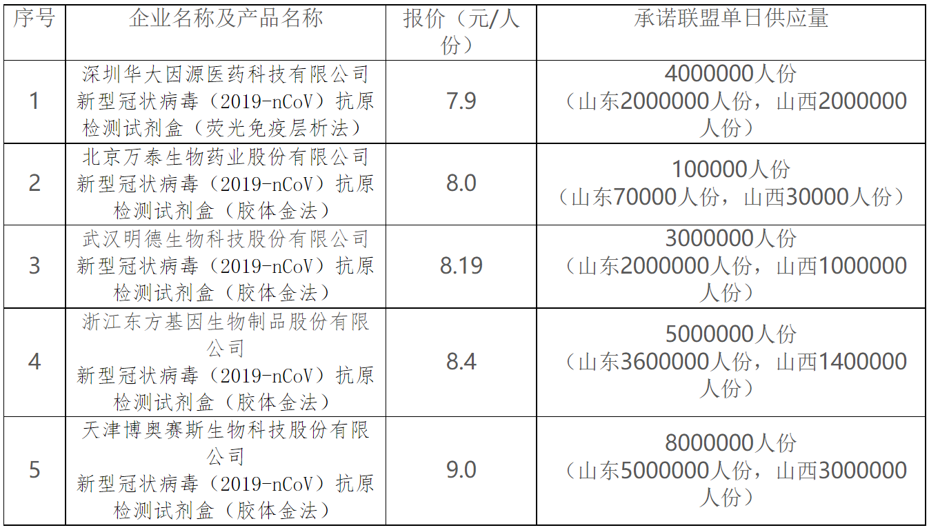 e公司讯,山东省公共资源交易中心公布鲁晋联盟新冠抗原检测试剂专项集采中选结果。中选企业分别为:华大因源(7.9元/人份)、万泰生物(8元/人份)、明德生物(8.19元/人份)、东方生物(8.4元/人份)、天津博奥赛斯(9元/人份),前述公司的承诺联盟单日供应量分别为:400万人份、10万人份、300万人份、500万人份、800万人份。
