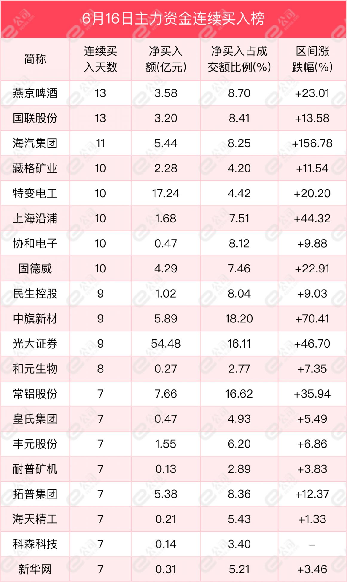 从连续买卖来看,燕京啤酒、国联股份、海汽集团获主力资金连续净买入天数居前,分别为13天、13天、11天,期间净买入额分别为3.58亿元、3.2亿元、5.44亿元,占期间成交额比例分别为8.7%、8.41%、8.25%。