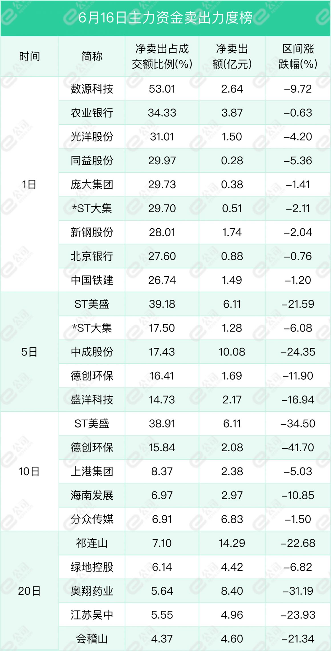 数源科技、农业银行、光洋股份遭主力资金大力卖出,净卖出额占当日成交额比例分别为53.01%、34.33%、31.01%,净卖出额分别为2.64亿元、3.87亿元、1.5亿元。