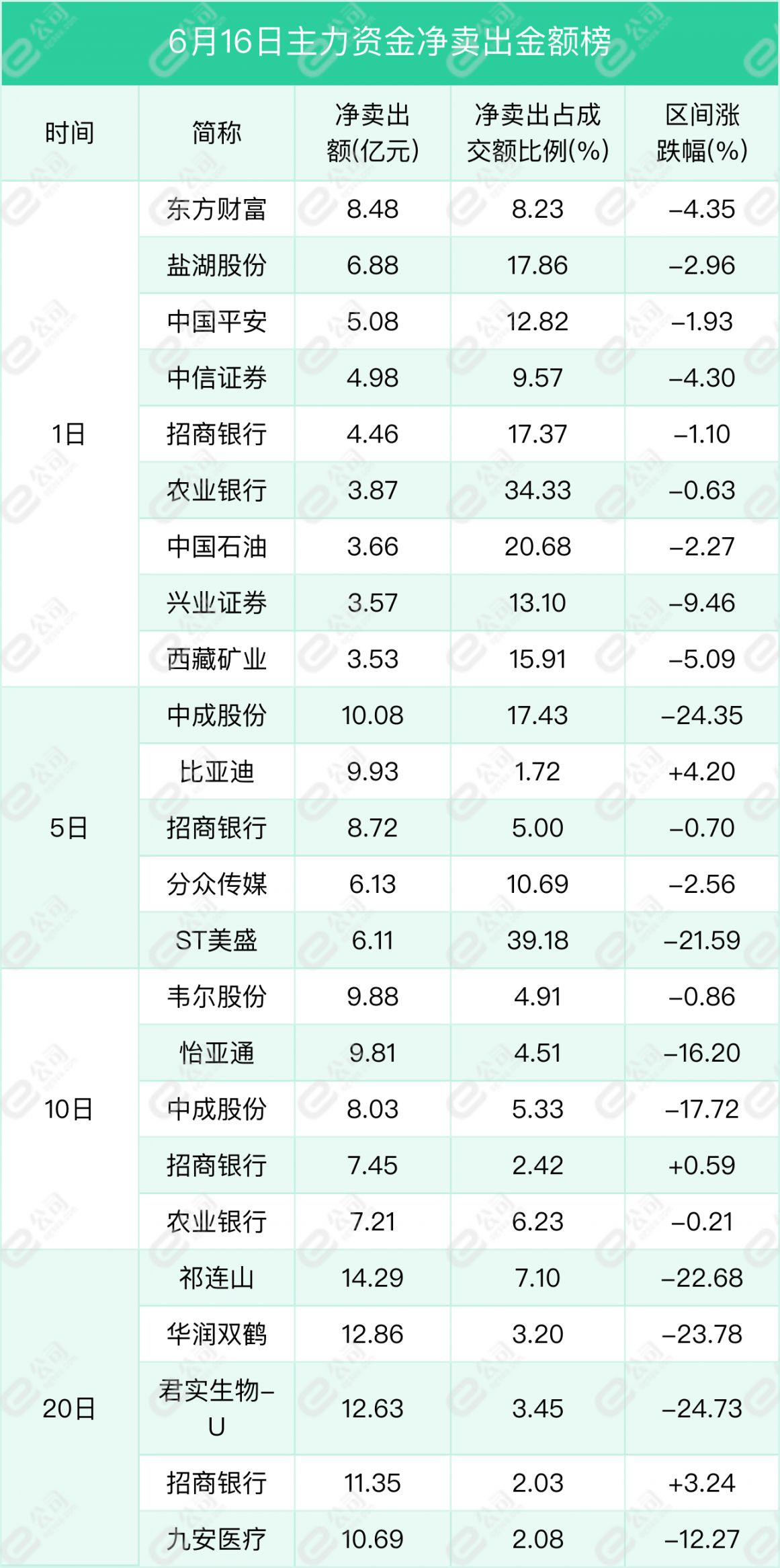 东方财富、盐湖股份、中国平安获主力资金净卖出金额居前,分别为8.48亿元、6.88亿元、5.08亿元,占当日成交额8.23%、17.86%、12.82%。