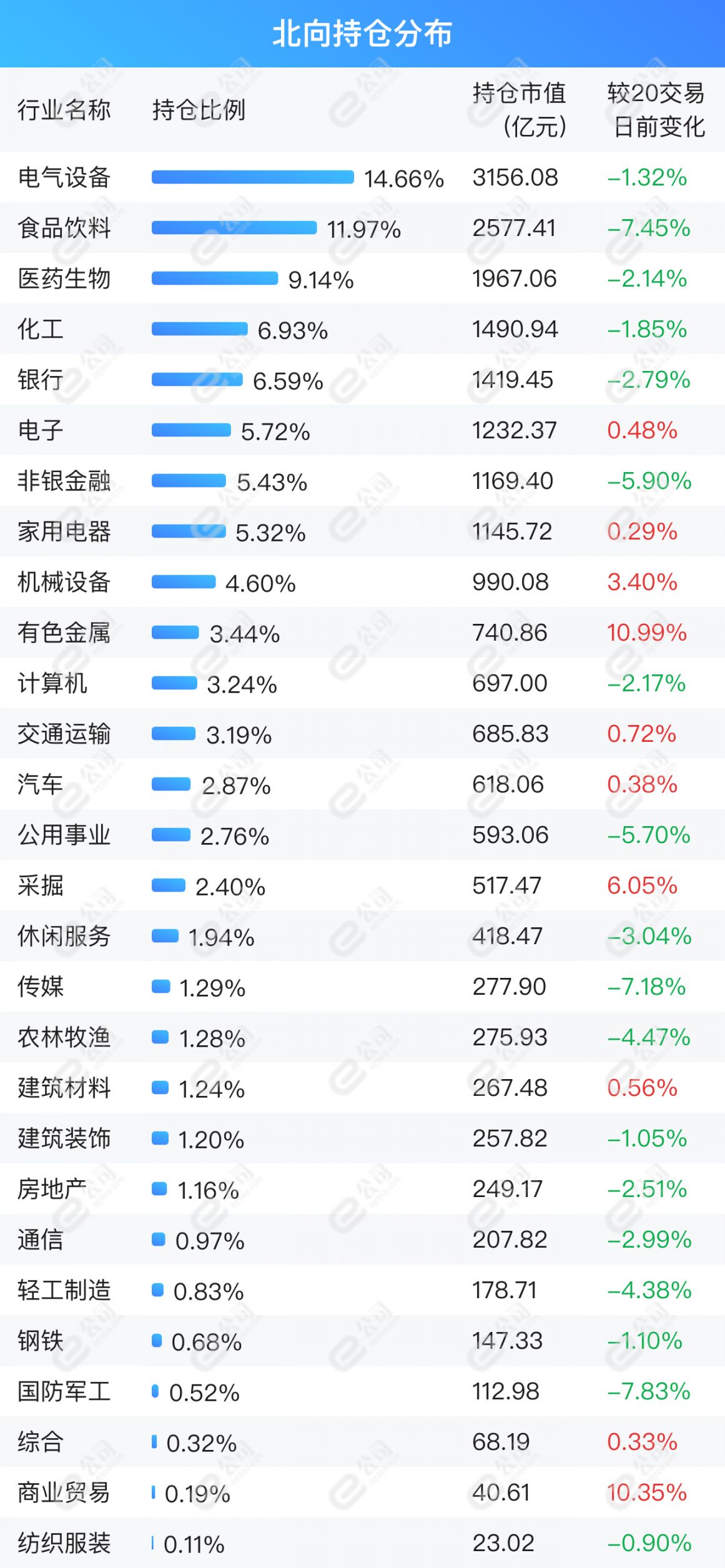 北向资金持仓市值前五行业为电气设备、食品饮料、医药生物、化工、银行,占持仓总市值49.29%。