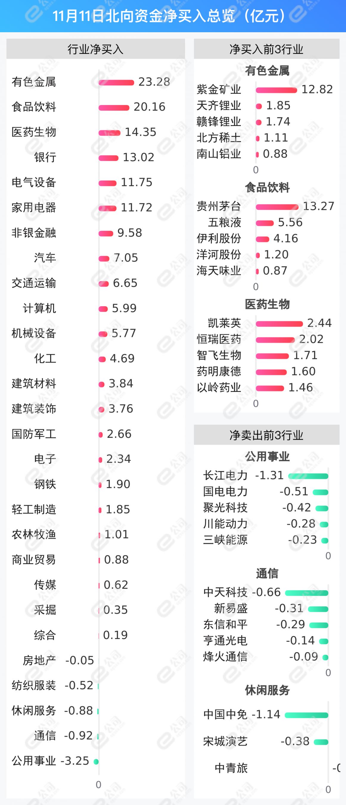 有色金属、食品饮料、医药生物获北向资金净买入金额居前,分别为23.28亿元、20.16亿元、14.35亿元。