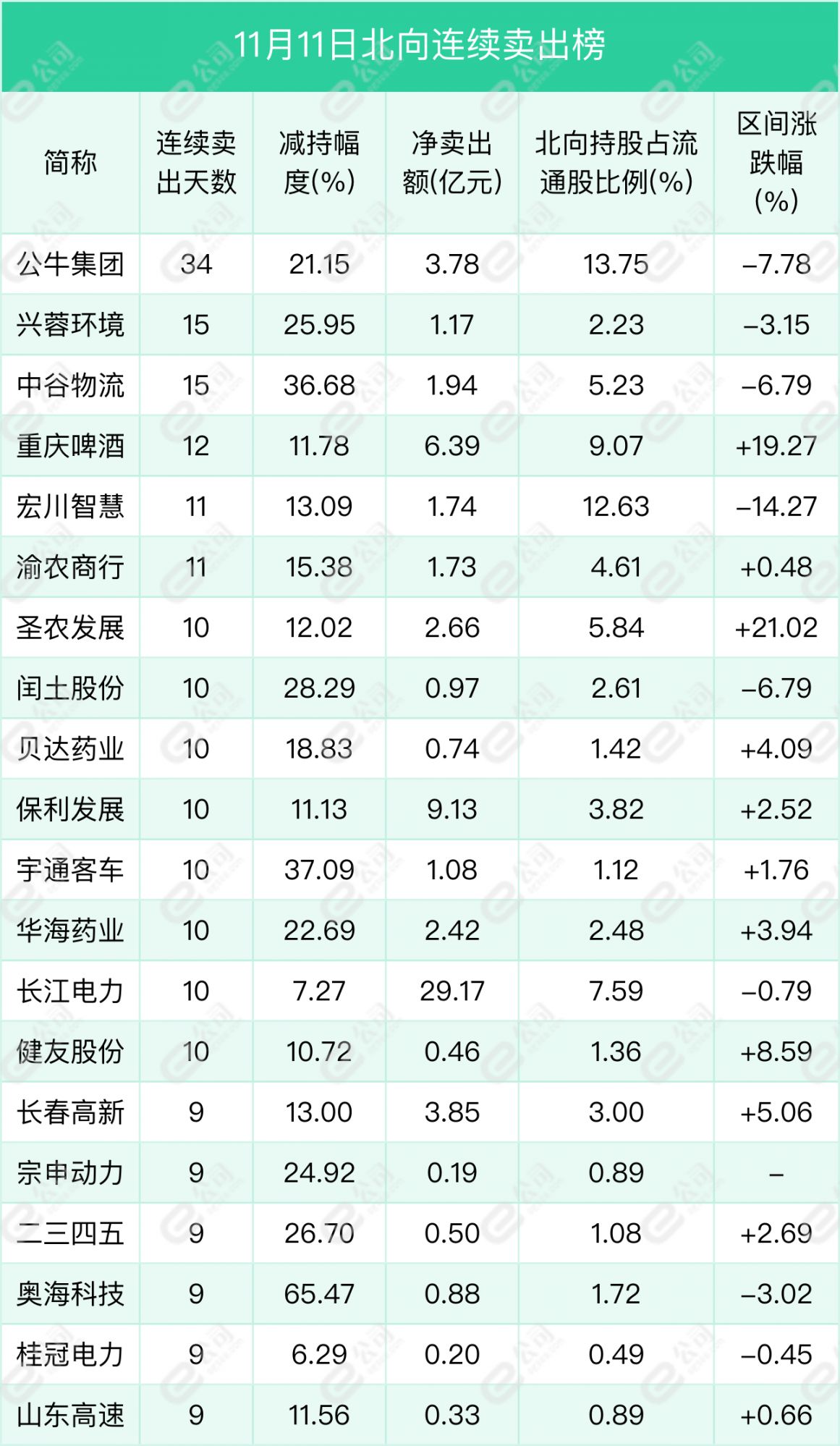 公牛集团、兴蓉环境、中谷物流遭北向资金连续净卖出天数居前,分别为34天、15天、15天,期间净卖出额分别为3.78亿元、1.17亿元、1.94亿元,期间减持幅度分别为21.15%、25.95%、36.68%。