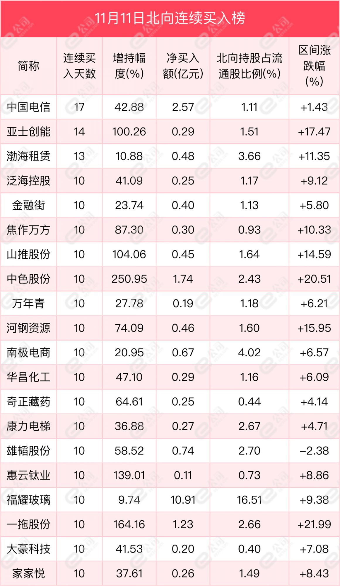 从连续买卖来看,中国电信、亚士创能、渤海租赁获北向资金连续净买入天数居前,分别为17天、14天、13天,期间净买入额分别为2.57亿元、0.29亿元、0.48亿元,期间增持幅度分别为42.88%、100.26%、10.88%。