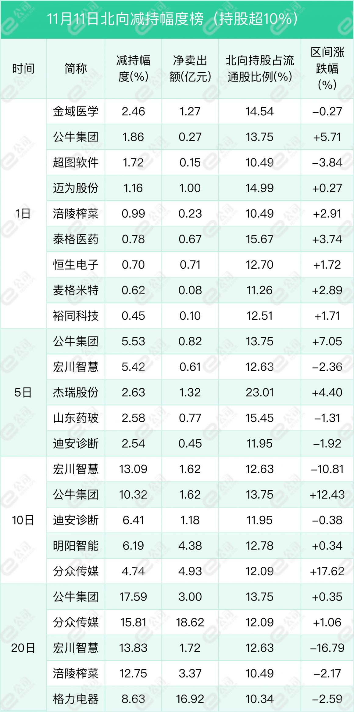 金域医学、公牛集团、超图软件遭北向资金减持幅度居前,分别为2.46%、1.86%、1.72%。
