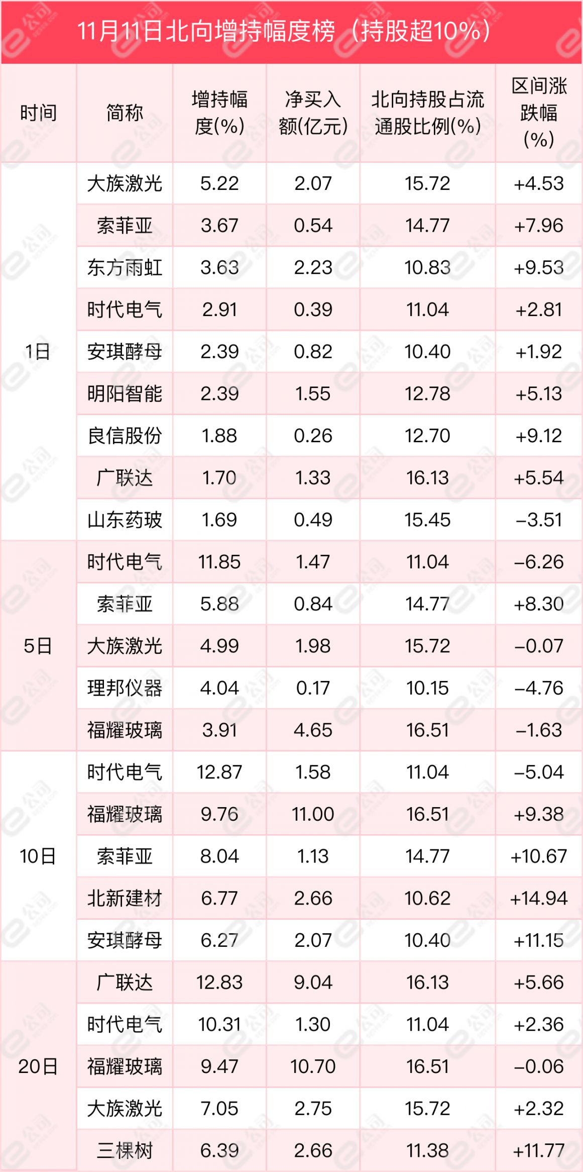 从增减持幅度来看,北向资金持股占流通股比例超10%的个股中,大族激光、索菲亚、东方雨虹获北向资金增持幅度居前,分别为5.22%、3.67%、3.63%。