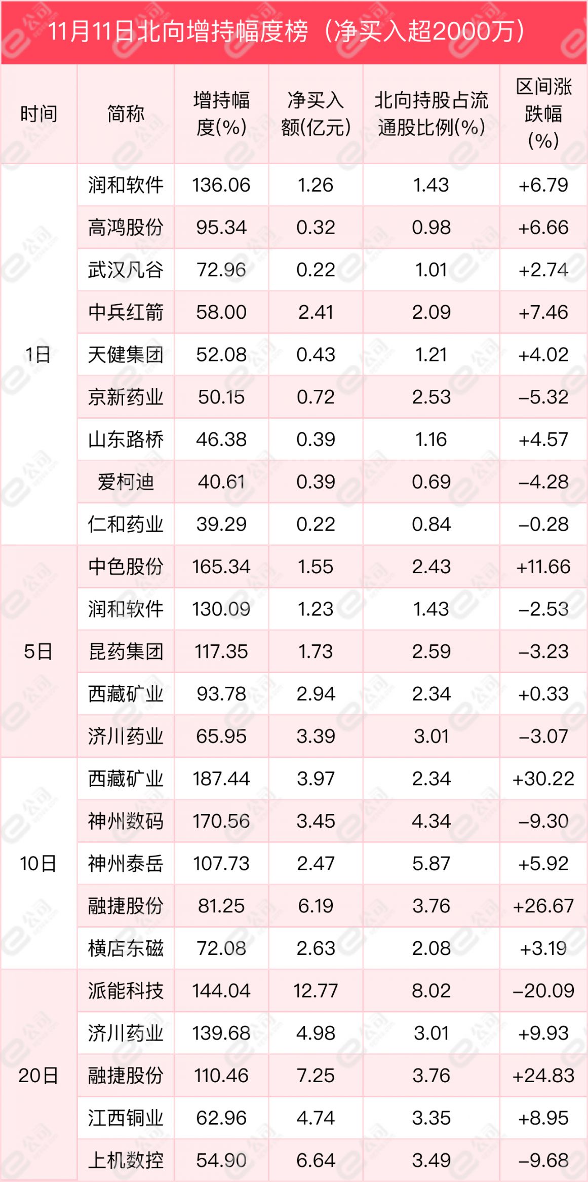 从增减持幅度来看,单日净买卖超2000万元以上的个股中,润和软件、高鸿股份、武汉凡谷获北向资金增持幅度居前,分别为136.06%、95.34%、72.96%。