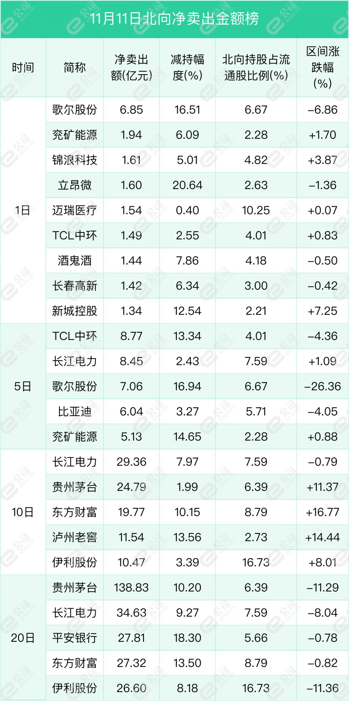 歌尔股份、兖矿能源、锦浪科技遭北向资金净卖出金额居前,分别为6.85亿元、1.94亿元、1.61亿元,减持幅度分别为16.51%、6.09%、5.01%。