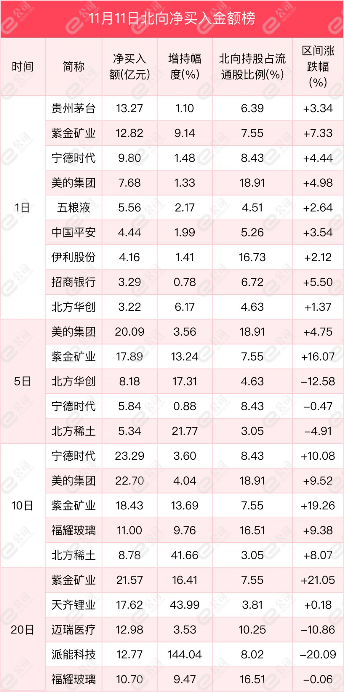 从买卖金额来看,贵州茅台、紫金矿业、宁德时代获北向资金净买入金额居前,分别为13.27亿元、12.82亿元、9.8亿元,增持幅度分别为1.1%、9.14%、1.48%。