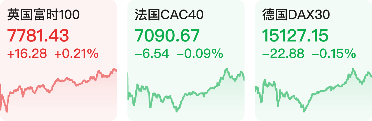 欧洲三大指数涨跌不一。截至收盘,英国富时100指数涨0.21%,法国CAC40指数跌0.09%,德国DAX30指数跌0.15%。