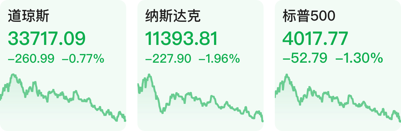 美股三大指数集体收跌,道指跌0.77%,纳指跌1.96%,标普500指数跌1.3%,热门科技股普跌,英伟达跌近6%,苹果、微软、谷歌均跌超2%。特斯拉跌超6%。