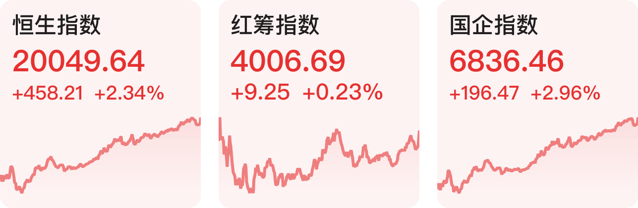 恒生指数收涨2.34%,恒生科技指数收涨4.74%;美团、腾讯控股涨超8%,小米集团涨超7%,快手涨近5%,阿里巴巴涨超4%。