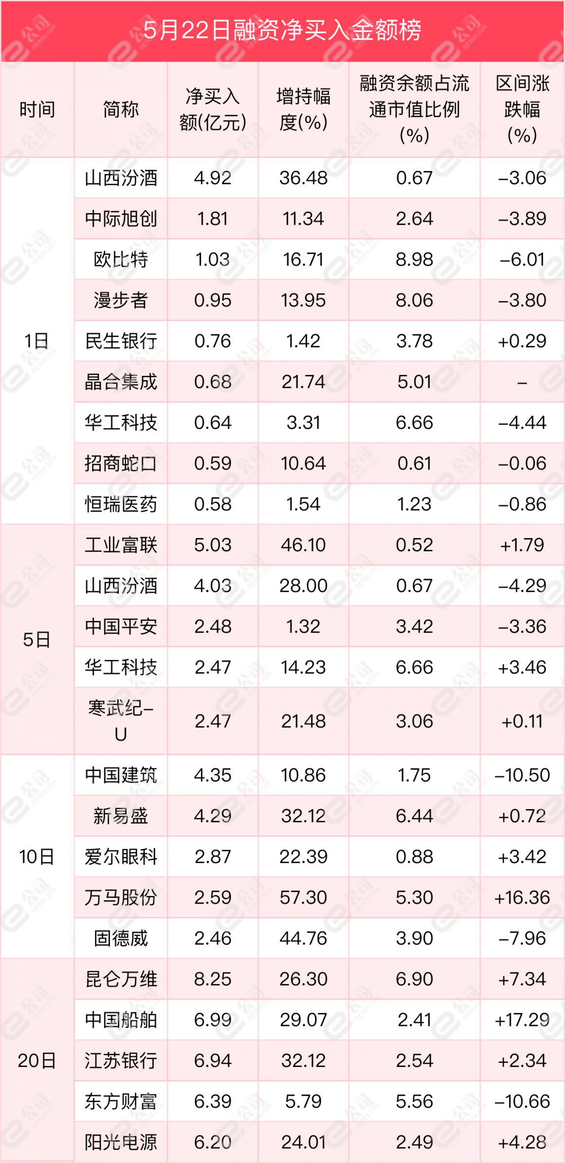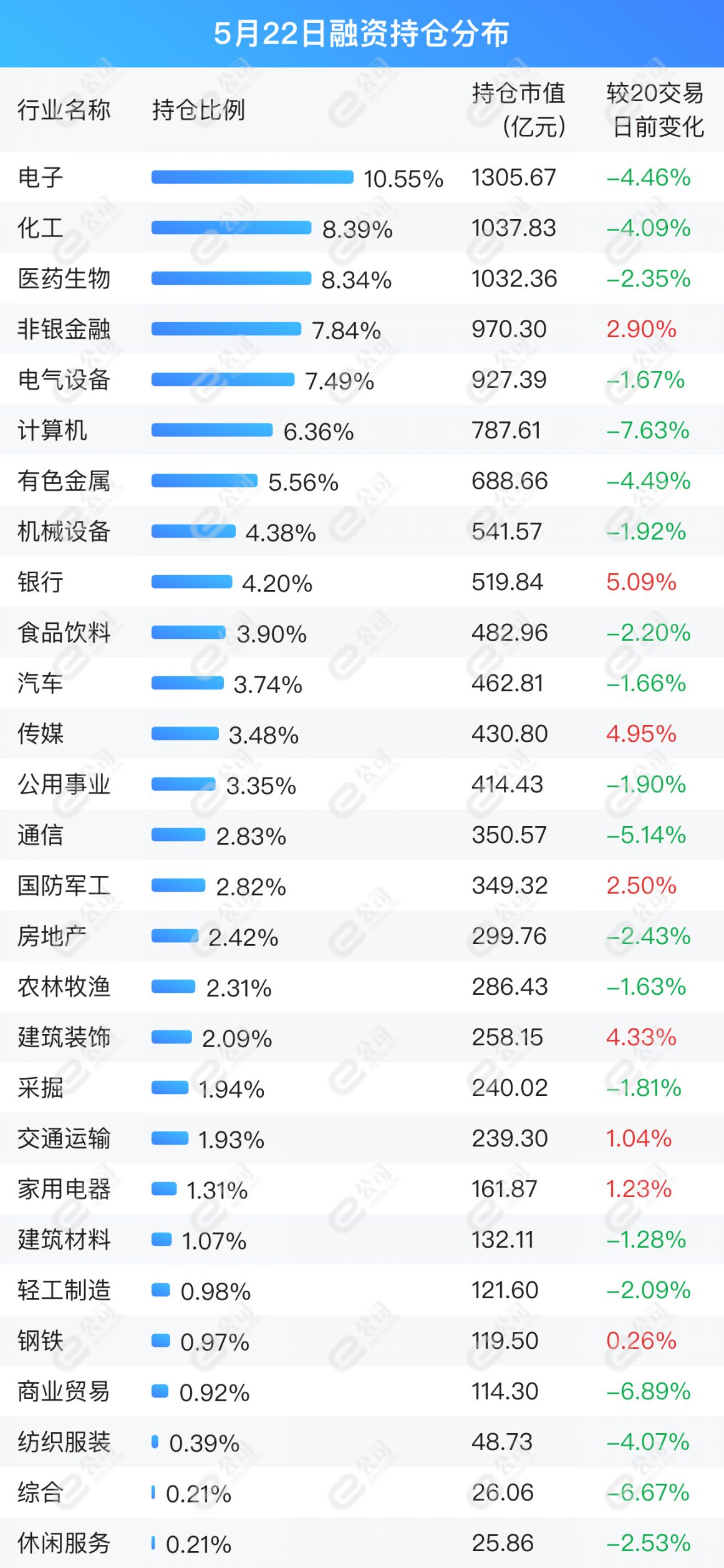 e公司数据统计显示,截至5月22日,融资持仓市值前五行业为电子、化工、医药生物、非银金融、电气设备,占持仓总市值42.61%。