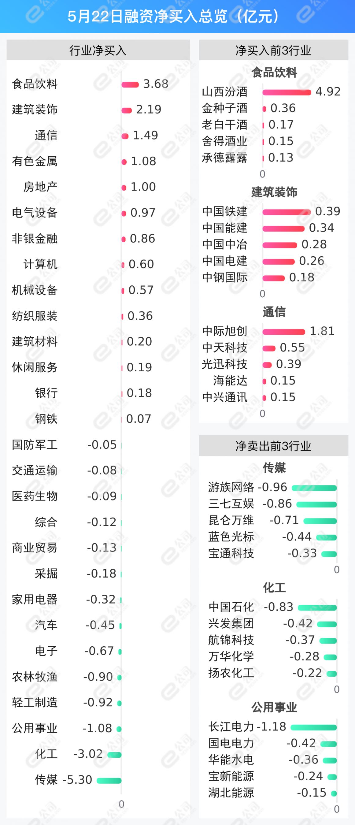 传媒、化工、公用事业遭融资净卖出金额居前,分别为5.3亿元、3.02亿元、1.08亿元。