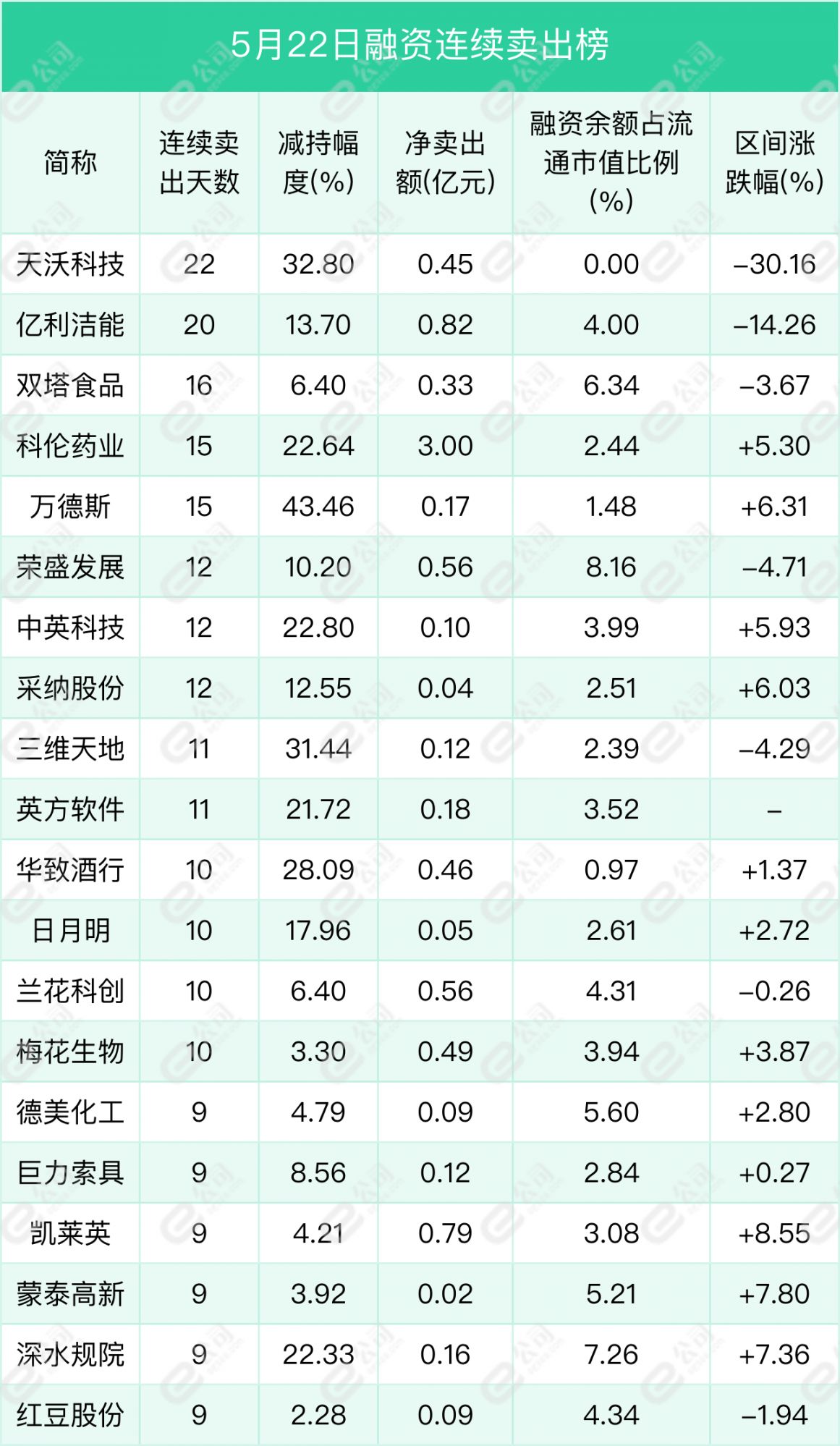 天沃科技、亿利洁能、双塔食品遭融资连续净卖出天数居前,分别为22天、20天、16天,期间净卖出额分别为0.45亿元、0.82亿元、0.33亿元,期间减持幅度分别为32.8%、13.7%、6.4%。