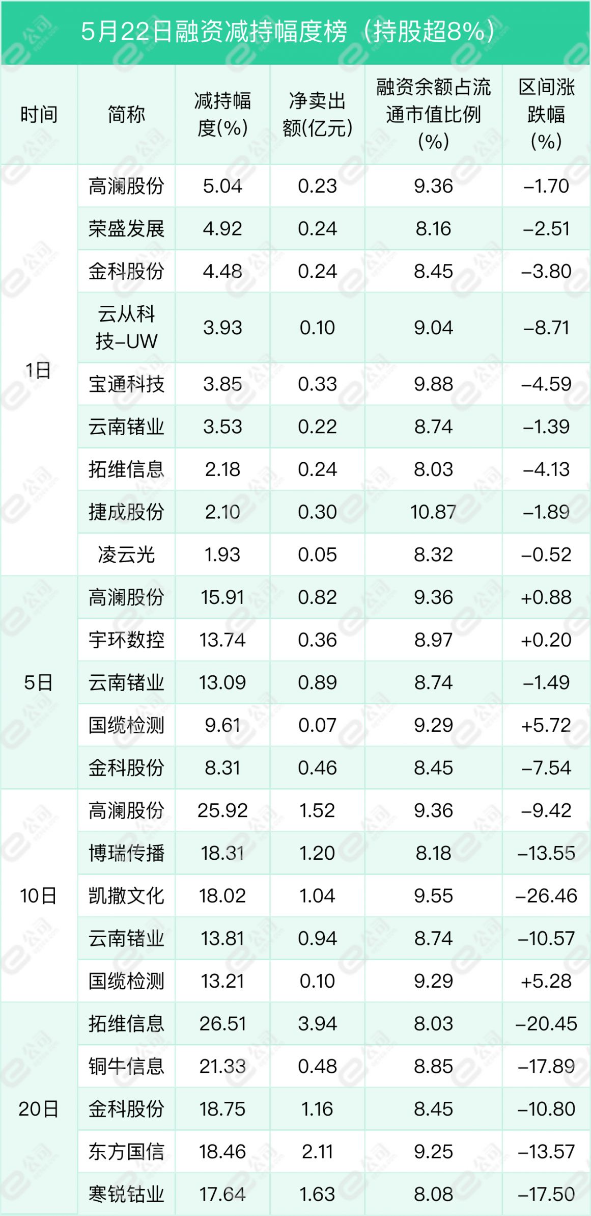 高澜股份、荣盛发展、金科股份遭融资减持幅度居前,分别为5.04%、4.92%、4.48%。