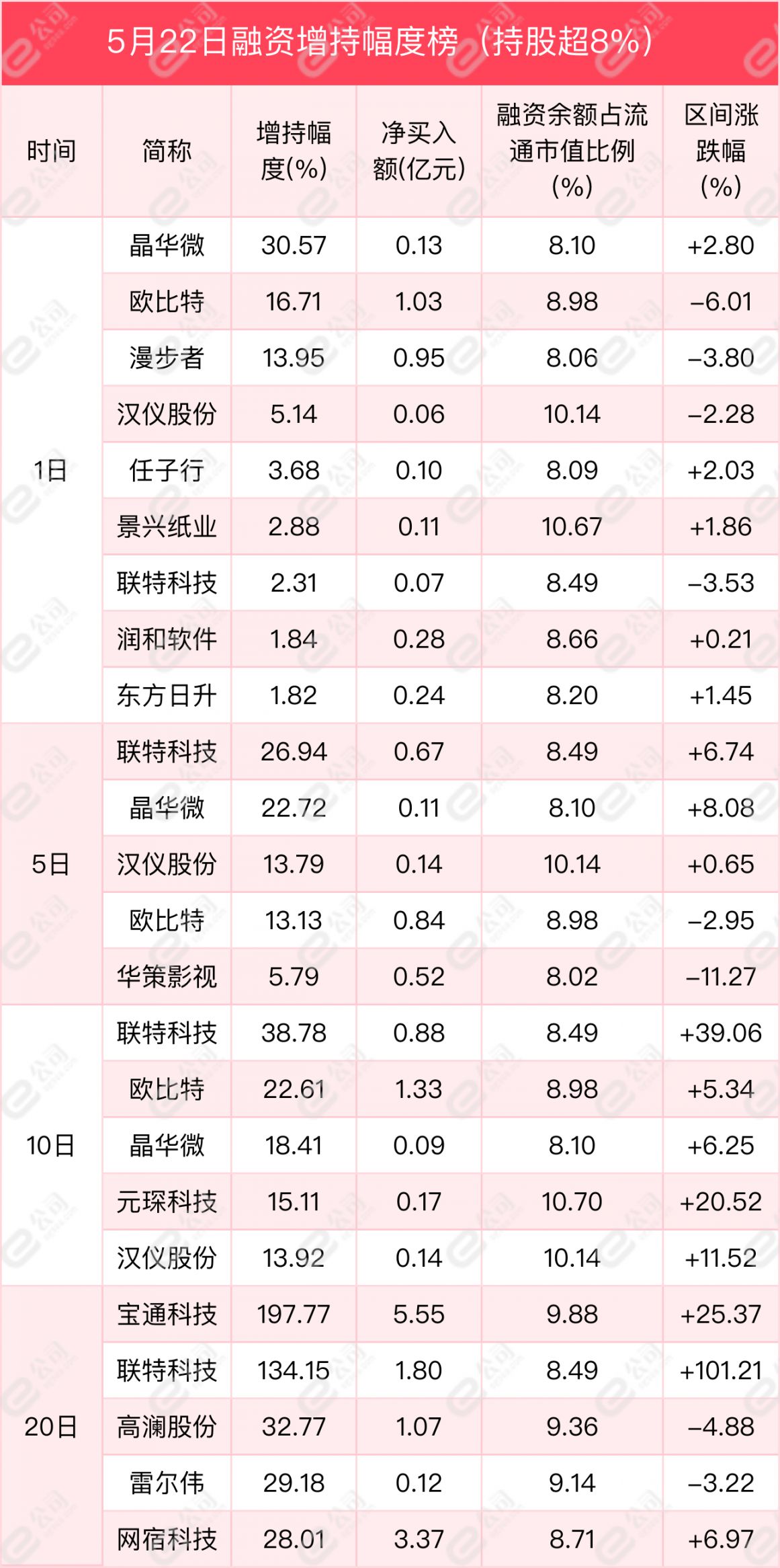 从增减持幅度来看,融资余额占流通股比例超8%的个股中,晶华微、欧比特、漫步者获融资增持幅度居前,分别为30.57%、16.71%、13.95%。