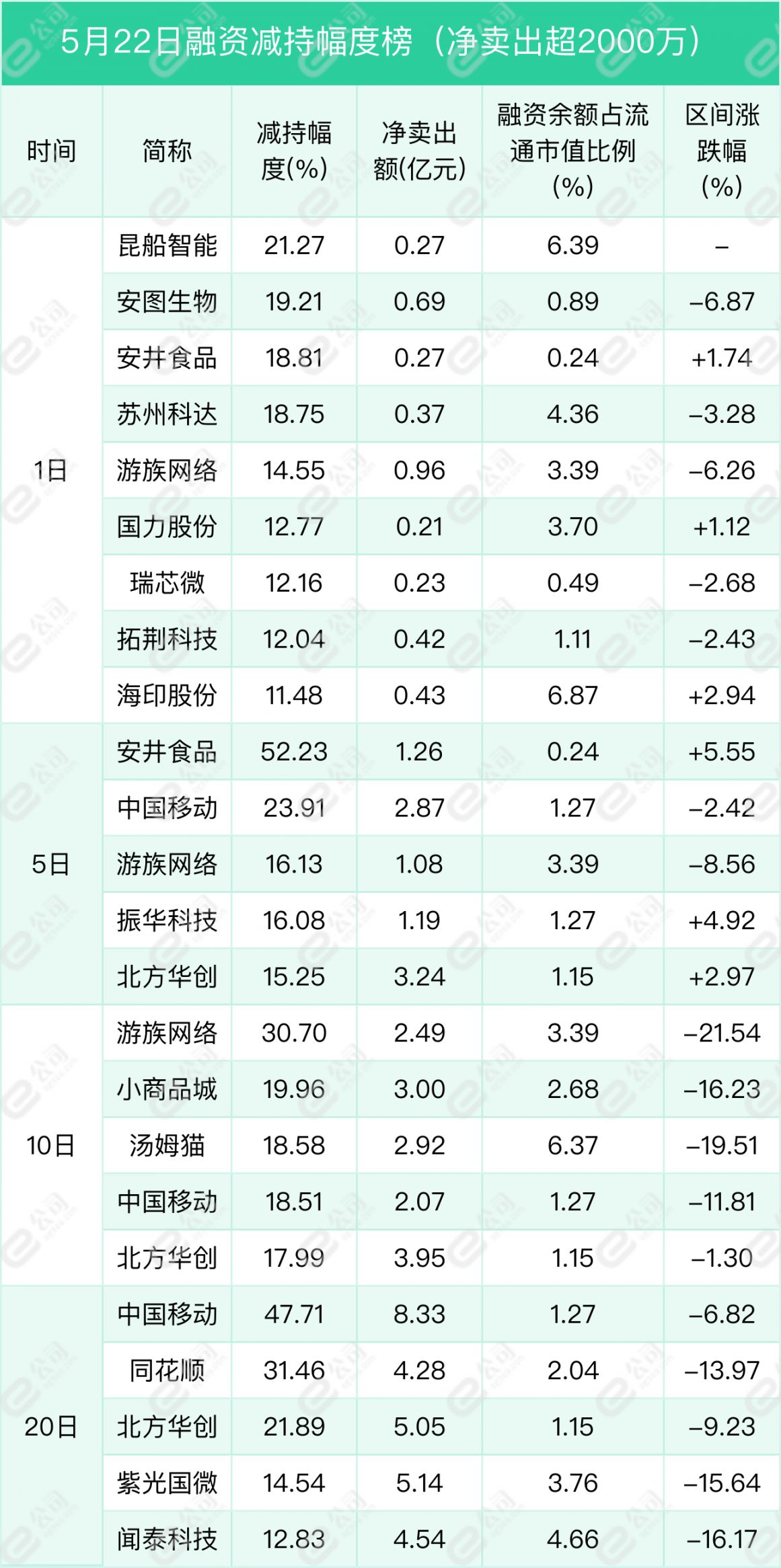 昆船智能、安图生物、安井食品遭融资减持幅度居前,分别为21.27%、19.21%、18.81%。