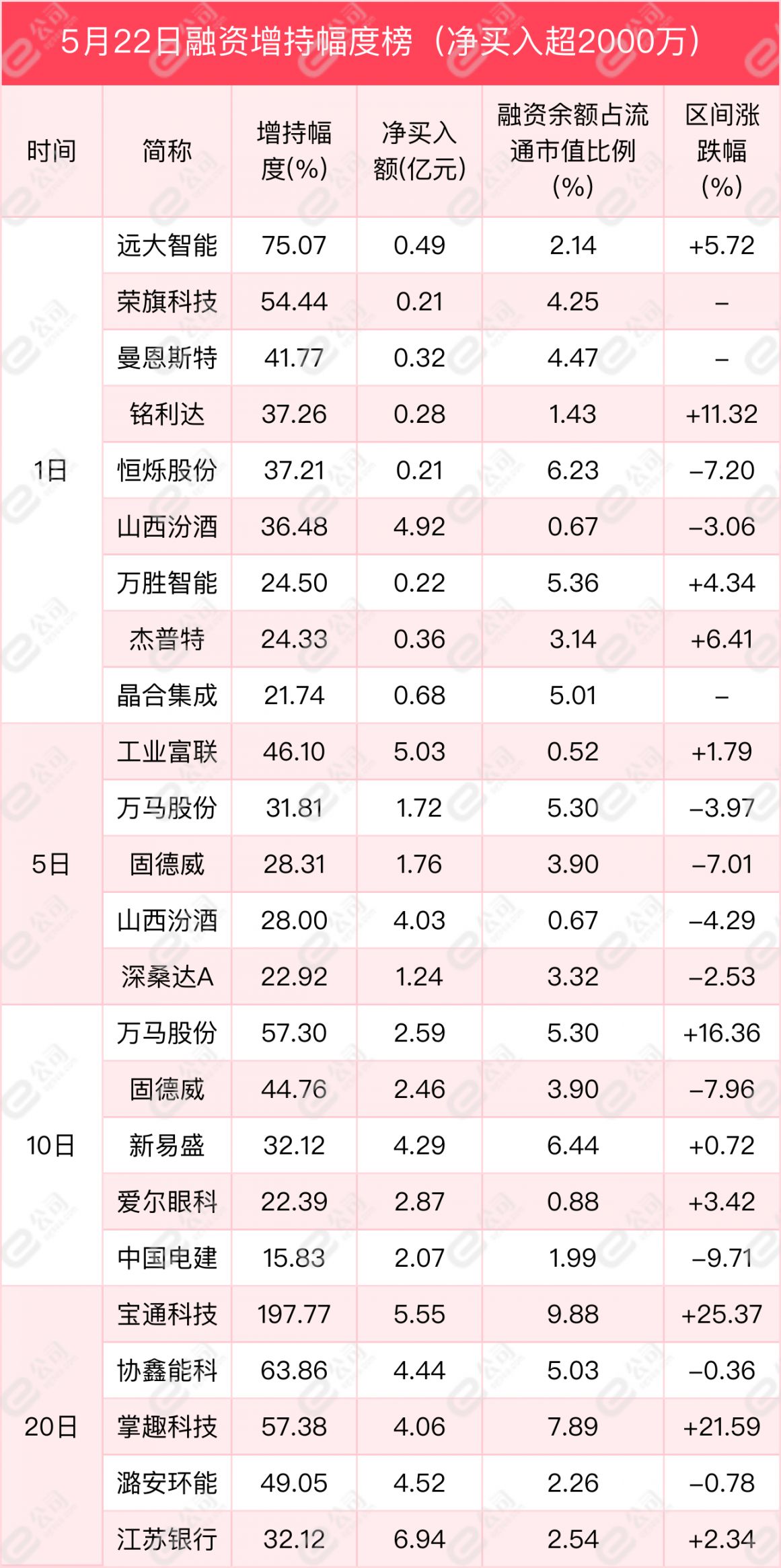 从增减持幅度来看,单日净买卖超2000万元以上的个股中,远大智能、荣旗科技、曼恩斯特获融资增持幅度居前,分别为75.07%、54.44%、41.77%。