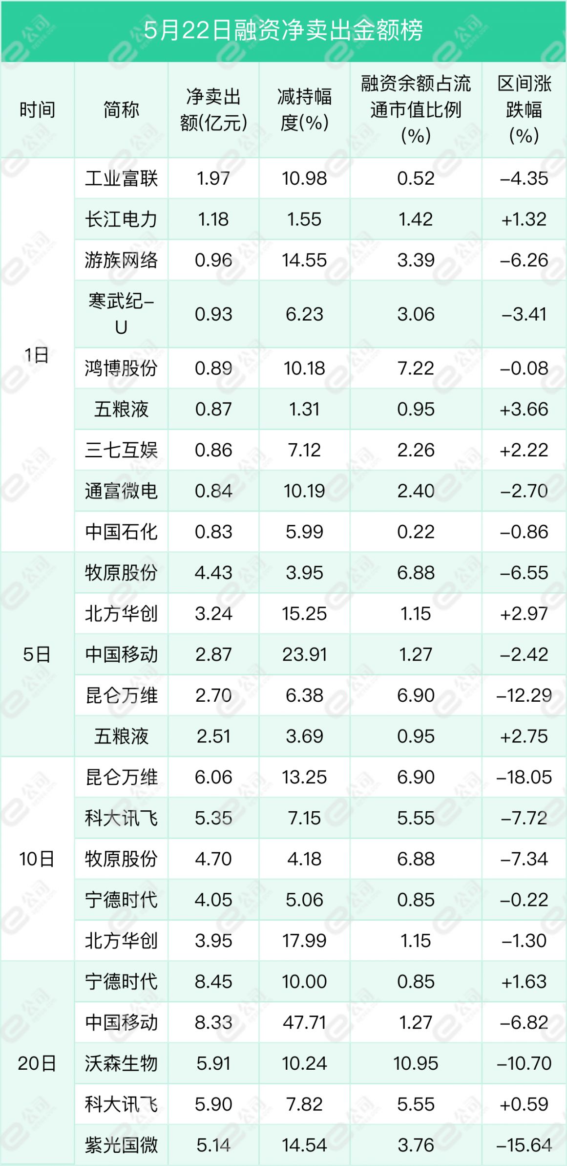 工业富联、长江电力、游族网络遭融资净卖出金额居前,分别为1.97亿元、1.18亿元、0.96亿元,减持幅度分别为10.98%、1.55%、14.55%。