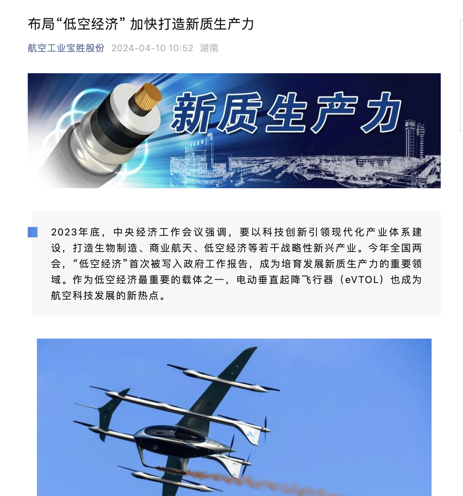 e公司讯,宝胜股份今日官微消息,作为低空经济最重要的载体之一,eVTOL成为航空科技发展的新热点。宝胜股份及其旗下沈阳沈飞线束科技作为航空电线电缆及电气线路互联系统(EWIS)领域集成解决方案厂商,大力布局低空经济产业。公司从2019年开始关注eVTOL这一细分赛道,积极对接国内eVTOL初创企业,承接了多型eVTOL整机级EWIS系统集成研制项目,并提供整机线束、线缆相关产品及安装、测试、改装服务,得到了客户较高评价。下一步,宝胜股份将以进军eVTOL赛道为契机,在航空器、机载系统、任务设备等低空产业装备领域加大投入,进一步突破关键核心技术。