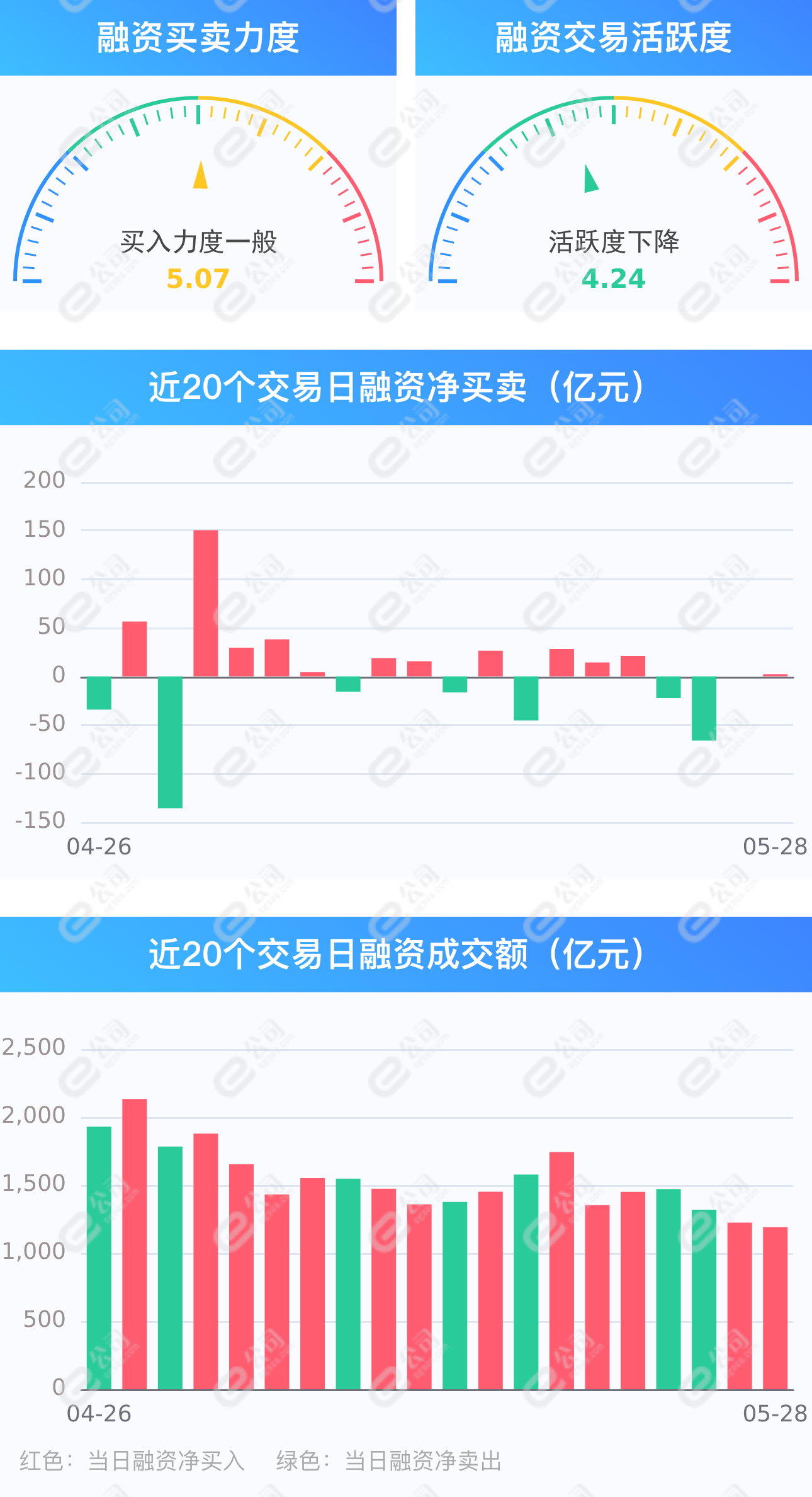 e公司讯,截至5月28日,上交所融资余额报7888.22亿元,较前一交易日增加1.11亿元;深交所融资余额报7023.60亿元,较前一交易日增加1.12亿元;两市合计14911.82亿元,较前一交易日增加2.23亿元,融资交易额1191.01亿元,占A股成交额16.06%,其中融资买入额596.62亿元,融资偿还额594.39亿元,交易活跃度下降2.76%。(此稿由证券时报e公司写稿机器人“快手小e”完成。)