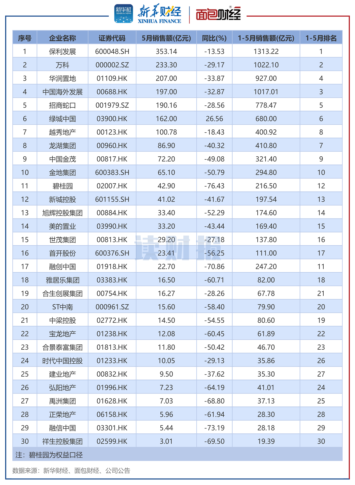 (原标题:TOP30上市房企5月销售额:降幅收窄 保利发展、万科、华润置地居前三)