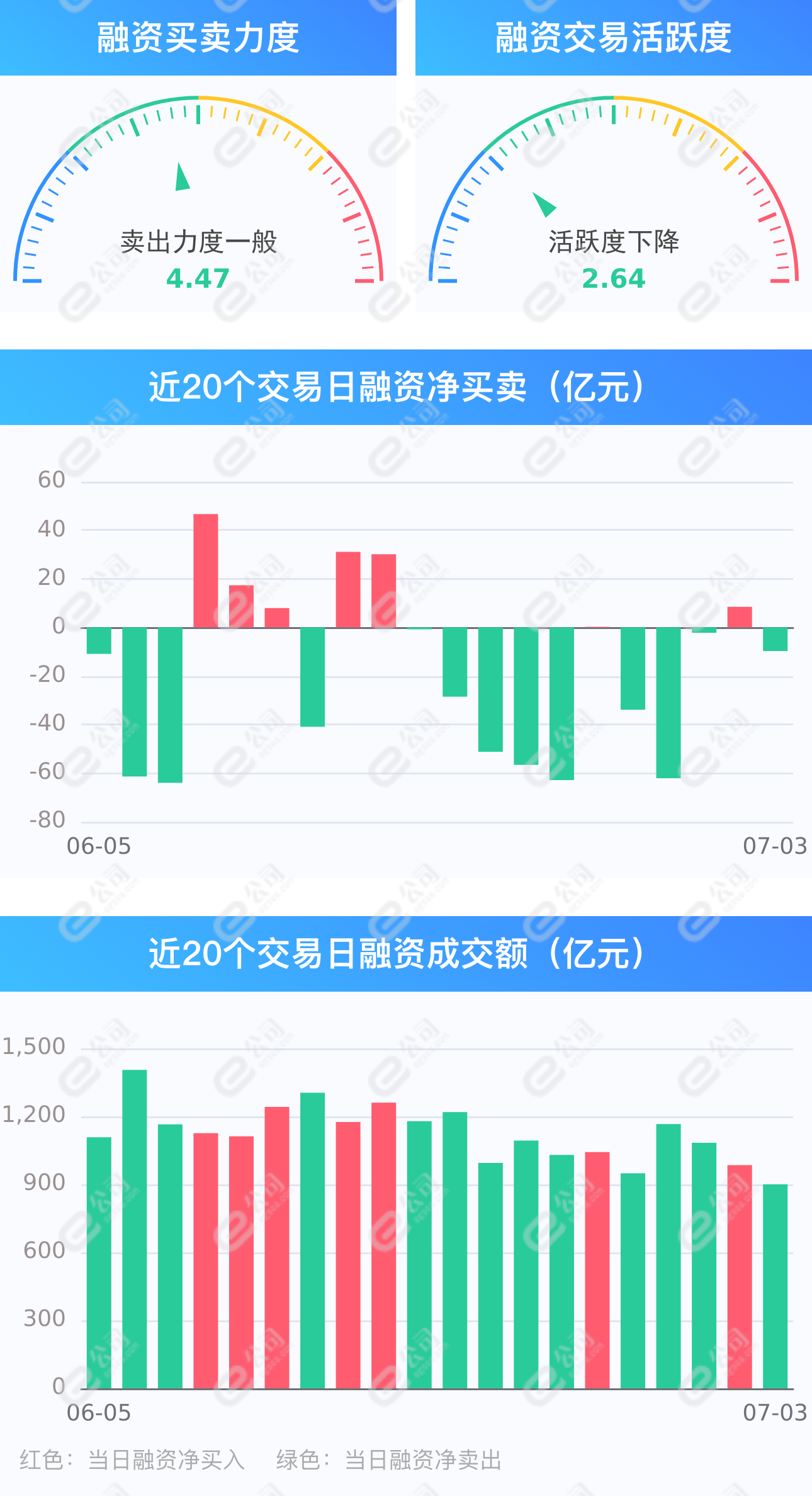 e公司讯,截至7月3日,上交所融资余额报7657.38亿元,较前一交易日减少1.04亿元;深交所融资余额报6821.93亿元,较前一交易日减少8.72亿元;两市合计14479.31亿元,较前一交易日减少9.76亿元,融资交易额900.31亿元,占A股成交额15.51%,其中融资买入额445.28亿元,融资偿还额455.03亿元,交易活跃度下降8.59%。