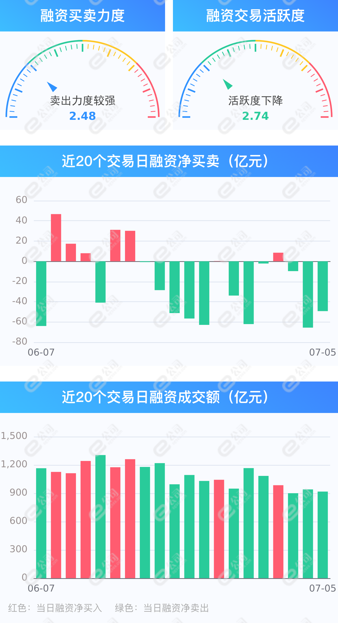 e公司讯,截至7月5日,上交所融资余额报7594.24亿元,较前一交易日减少26.86亿元;深交所融资余额报6770.18亿元,较前一交易日减少22.42亿元;两市合计14364.42亿元,较前一交易日减少49.28亿元,融资交易额917.67亿元,占A股成交额15.96%,其中融资买入额434.20亿元,融资偿还额483.47亿元,交易活跃度下降2.40%。(此稿由证券时报e公司写稿机器人“快手小e”完成。)