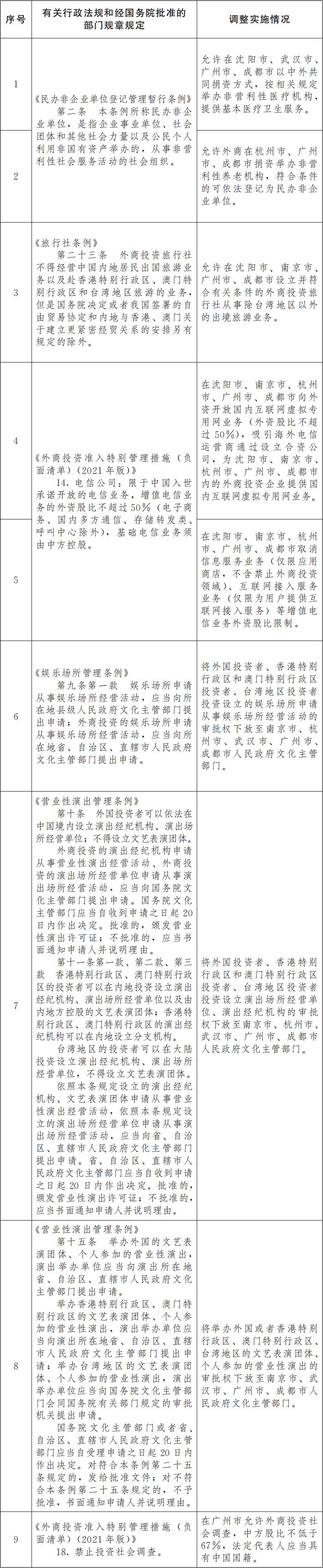 e公司讯,国务院消息,同意自即日起,在沈阳市、南京市、杭州市、武汉市、广州市、成都市等6个服务业扩大开放综合试点城市暂时调整实施《民办非企业单位登记管理暂行条例》《旅行社条例》《娱乐场所管理条例》《营业性演出管理条例》《外商投资准入特别管理措施(负面清单)(2021年版)》的有关规定。