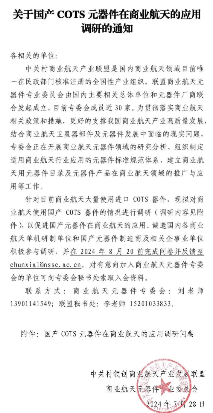 e公司讯,证券时报·e公司记者获悉,中关村商业航天产业联盟将开展国产COTS元器件在商业航天的应用调研,以促进国产元器件在商业航天的应用。据悉,为贯彻落实商业航天相关政策和措施,更好地支撑我国商业航天产业高质量发展,结合商业航天卫星器部件及元器件发展中面临的现实问题,专委会正在开展商业航天元器件领域的研究分析、组织制定适用商业航天行业应用的元器件标准规范体系、建立商业航天用元器件目录及元器件产品在商业航天领域的推广与应用等工作。针对目前商业航天大量使用进口COTS器件,现拟对商业航天使用国产COTS器件的情况进行调研,以促进国产元器件在商业航天的应用。