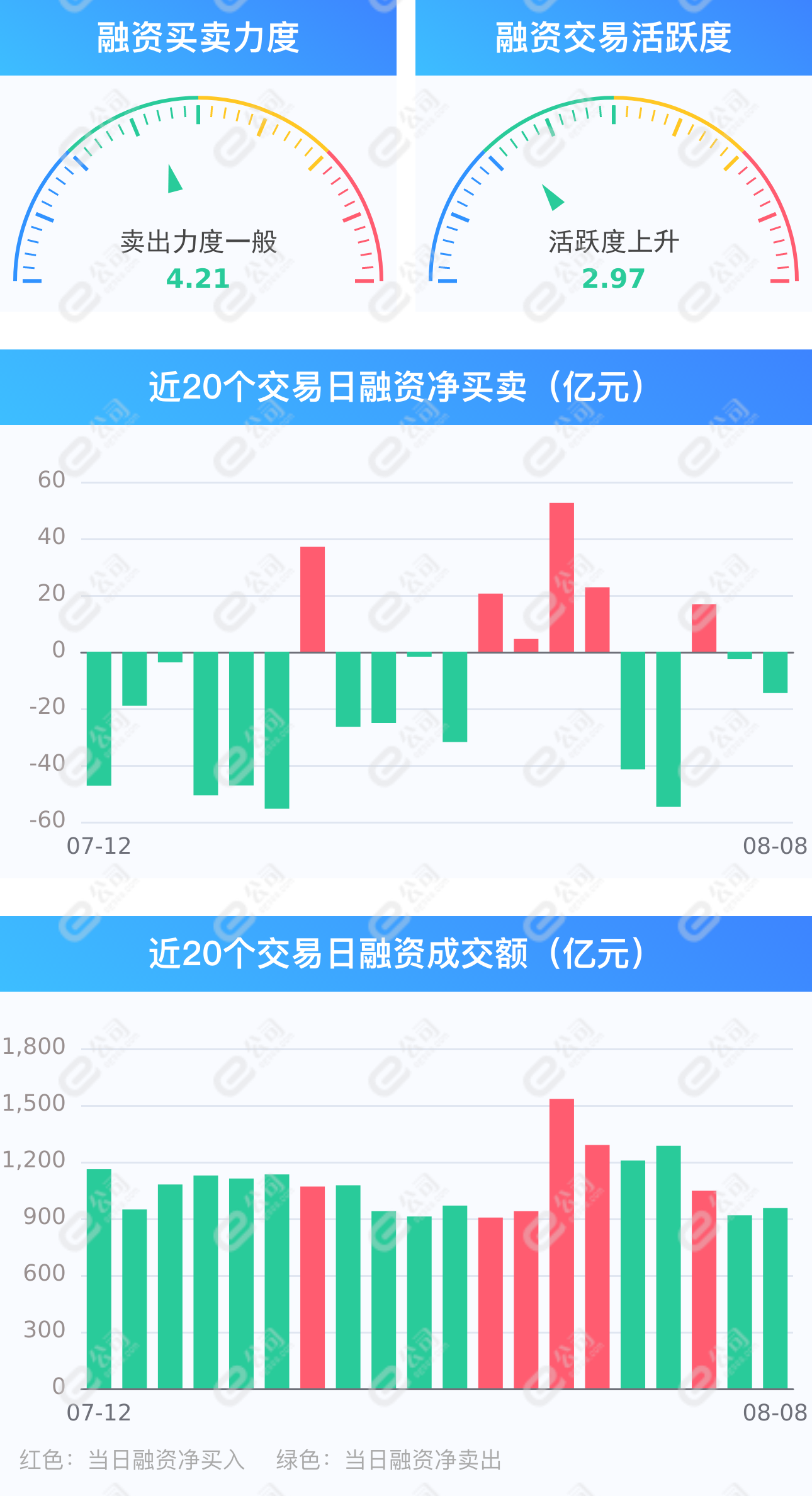 e公司讯,截至8月8日,上交所融资余额报7403.12亿元,较前一交易日减少2.26亿元;深交所融资余额报6649.54亿元,较前一交易日减少12.36亿元;两市合计14052.66亿元,较前一交易日减少14.62亿元,融资交易额953.79亿元,占A股成交额15.39%,其中融资买入额469.58亿元,融资偿还额484.21亿元,交易活跃度上升4.14%。