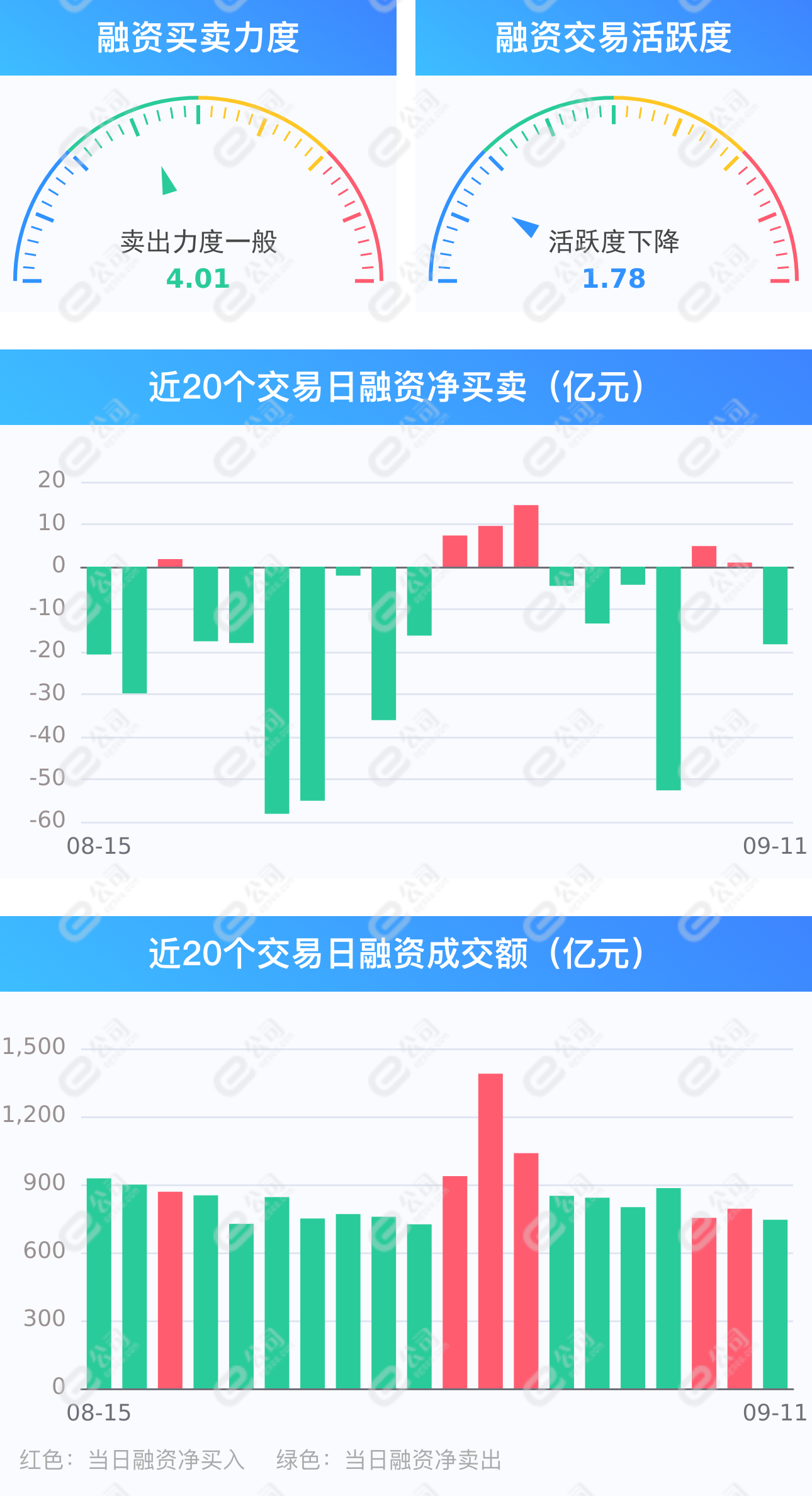 e公司讯,截至9月11日,上交所融资余额报7247.20亿元,较前一交易日减少10.85亿元;深交所融资余额报6484.30亿元,较前一交易日减少7.42亿元;两市合计13731.49亿元,较前一交易日减少18.27亿元,融资交易额743.67亿元,占A股成交额14.89%,其中融资买入额362.70亿元,融资偿还额380.97亿元,交易活跃度下降6.17%。