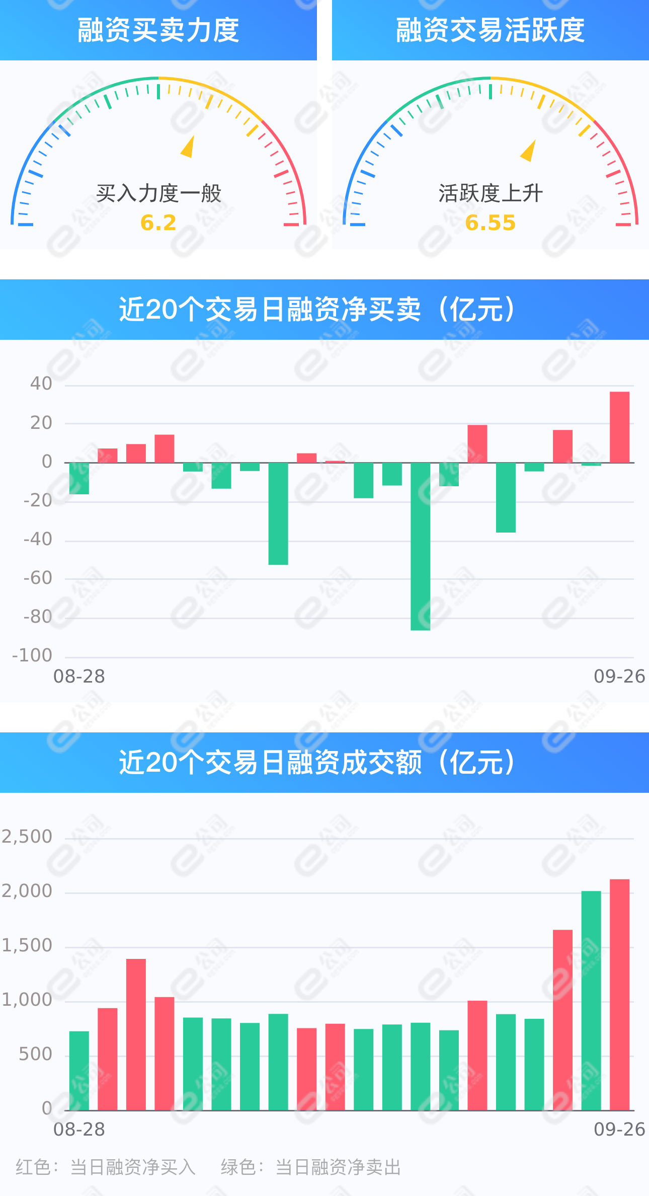 e公司讯,截至9月26日,上交所融资余额报7168.40亿元,较前一交易日增加8.87亿元;深交所融资余额报6483.74亿元,较前一交易日增加27.69亿元;两市合计13652.14亿元,较前一交易日增加36.56亿元,融资交易额2121.86亿元,占A股成交额18.25%,其中融资买入额1079.21亿元,融资偿还额1042.65亿元,交易活跃度上升5.45%。