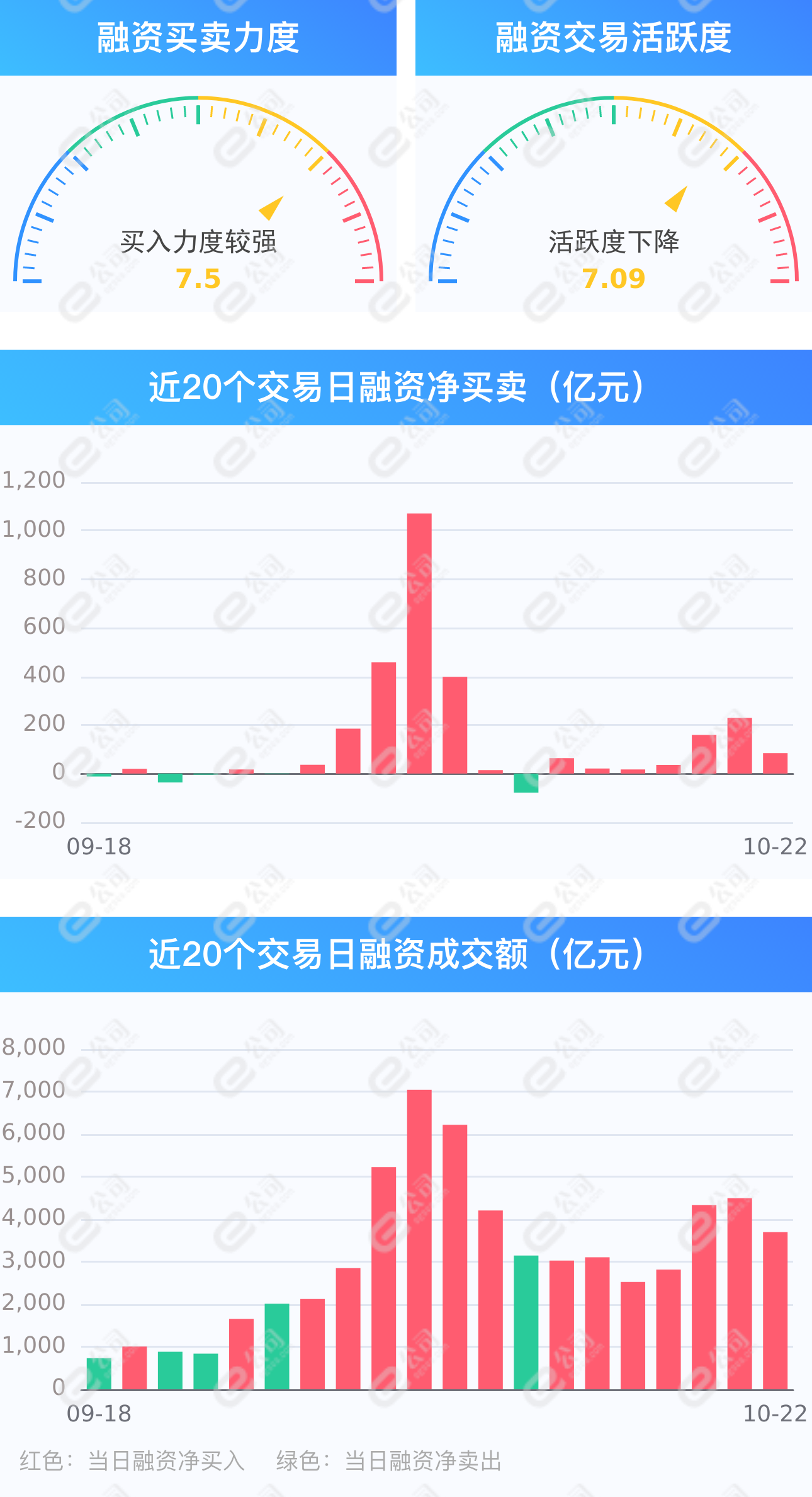 e公司讯,截至10月22日,上交所融资余额报8514.96亿元,较前一交易日增加45.48亿元;深交所融资余额报7796.23亿元,较前一交易日增加39.19亿元;两市合计16311.20亿元,较前一交易日增加84.67亿元,融资交易额3694.84亿元,占A股成交额19.32%,其中融资买入额1889.75亿元,融资偿还额1805.09亿元,交易活跃度下降17.75%。统计发现,融资客保持连续7日净买入,合计610.99亿元。