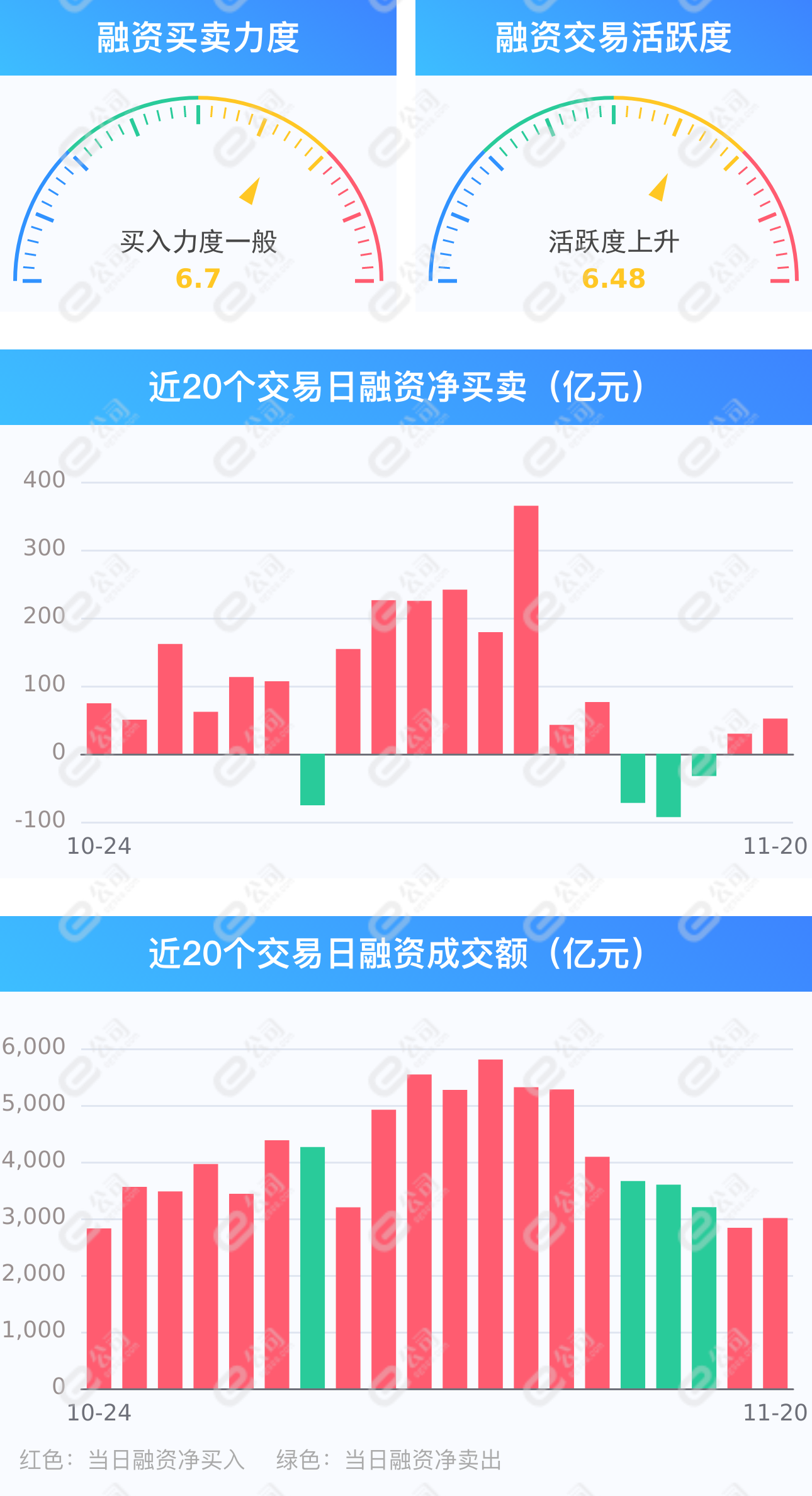 e公司讯,截至11月20日,上交所融资余额报9454.37亿元,较前一交易日增加17.95亿元;深交所融资余额报8819.26亿元,较前一交易日增加33.77亿元;两市合计18273.62亿元,较前一交易日增加51.72亿元,融资交易额3004.40亿元,占A股成交额18.61%,其中融资买入额1528.06亿元,融资偿还额1476.34亿元,交易活跃度上升6.07%。