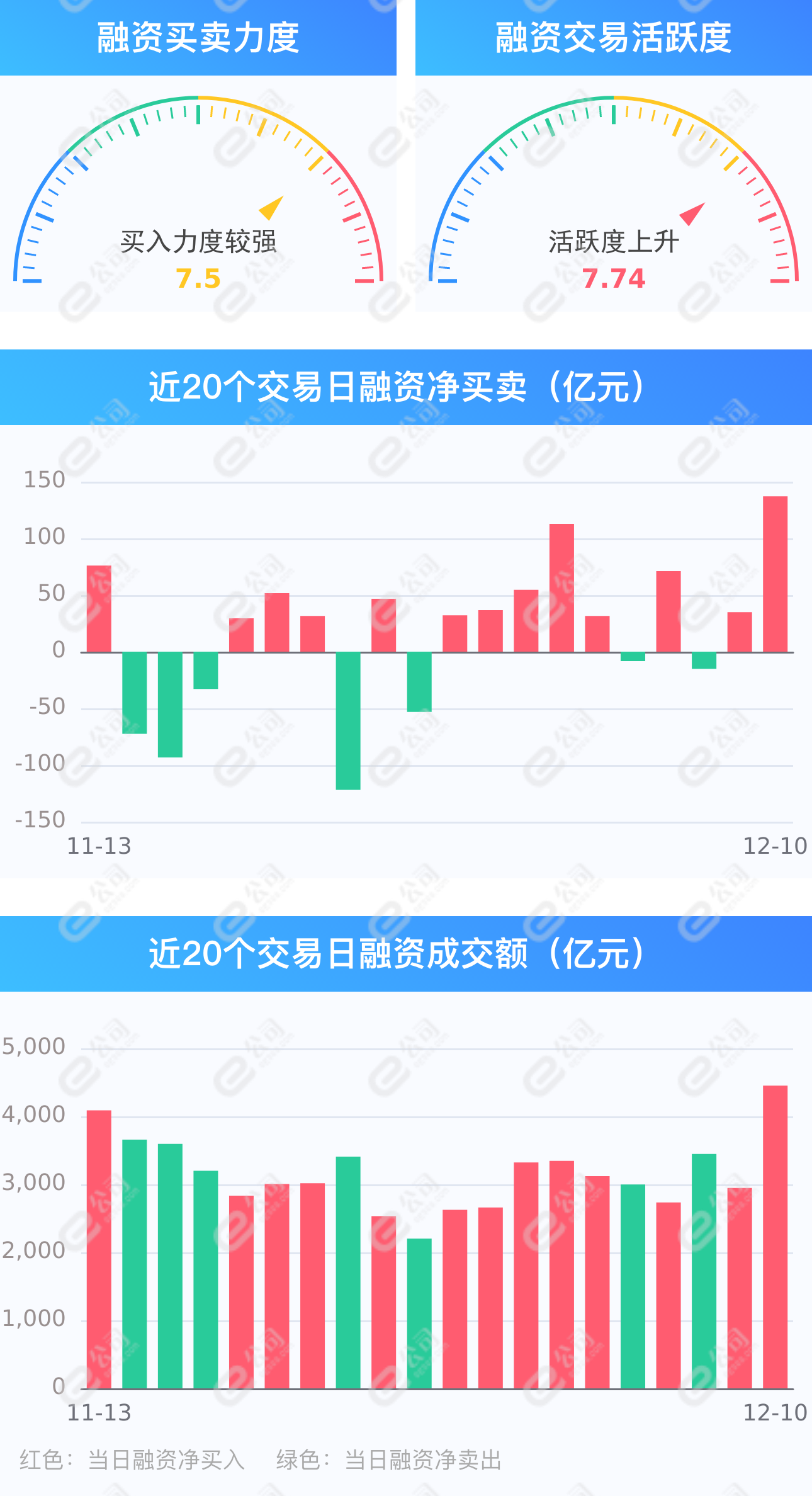 e公司讯,截至12月10日,上交所融资余额报9566.48亿元,较前一交易日增加51.95亿元;深交所融资余额报9097.57亿元,较前一交易日增加85.10亿元;两市合计18664.06亿元,较前一交易日增加137.05亿元,融资交易额4451.17亿元,占A股成交额20.23%,其中融资买入额2294.11亿元,融资偿还额2157.06亿元,交易活跃度上升51.11%。(此稿由证券时报e公司写稿机器人“快手小e”完成。)