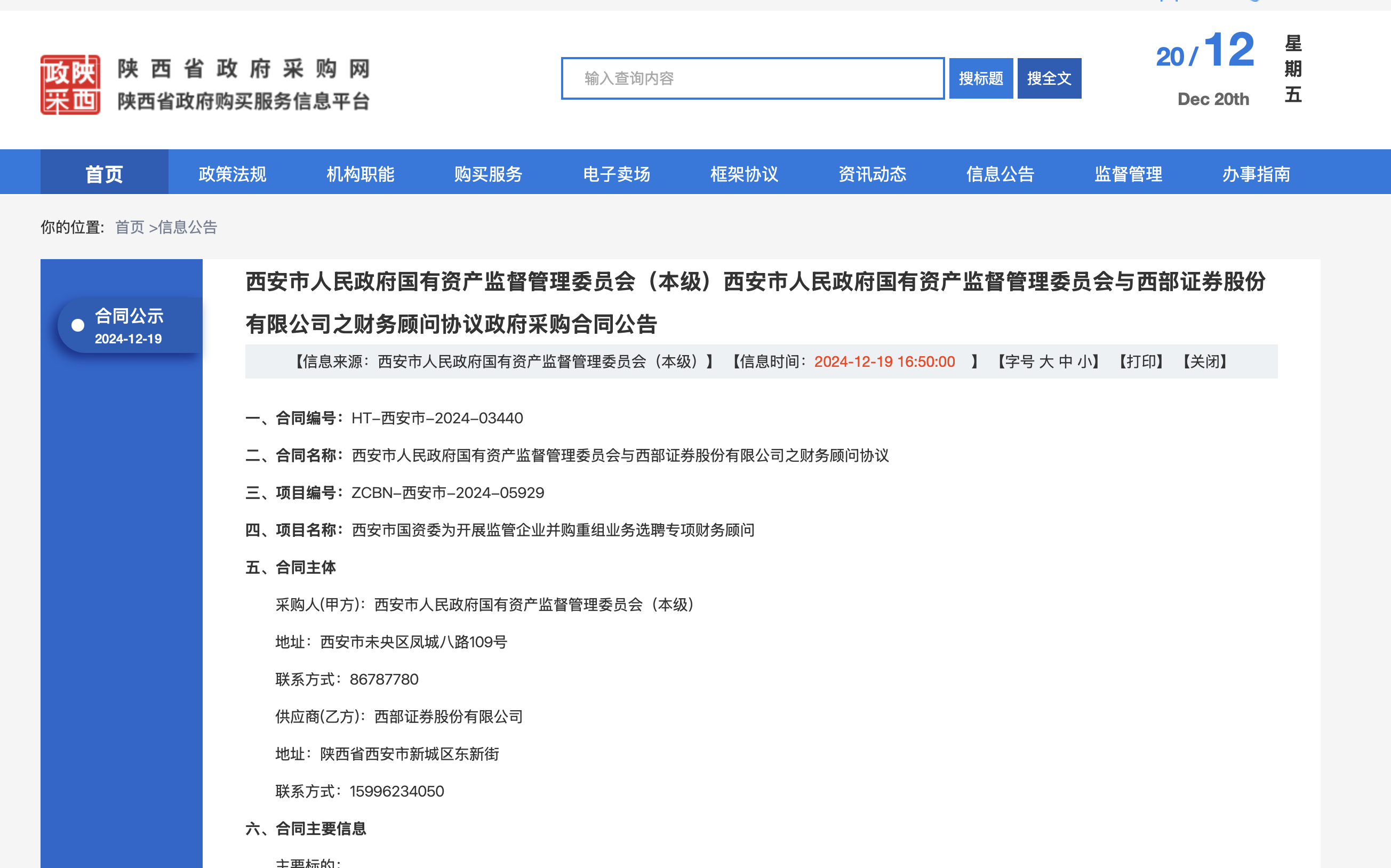 e公司讯,陕西省政府采购网发布《西安市人民政府国有资产监督管理委员会与西部证券股份有限公司之财务顾问协议》。采购人为西安市人民政府国有资产监督管理委员会。供应商为西部证券。服务要求包括:为本次并购重组咨询服务财务顾问,负责提供资本市场并购重组咨询和方案的设计及实施、项目推介和引进、交易架构设计等,并负责统筹协调会计师、律师、资产评估机构等所有中介机构以及对接相关监管机构的各项工作。派专人定期同市国资委进行沟通,协助做出合理安排。资料显示,目前西安市国资委旗下有15户监管企业,包括西安工业投资集团、西安农业投资(集团)有限公司、西安市轨道交通集团、西安航空航天投资股份有限公司等。