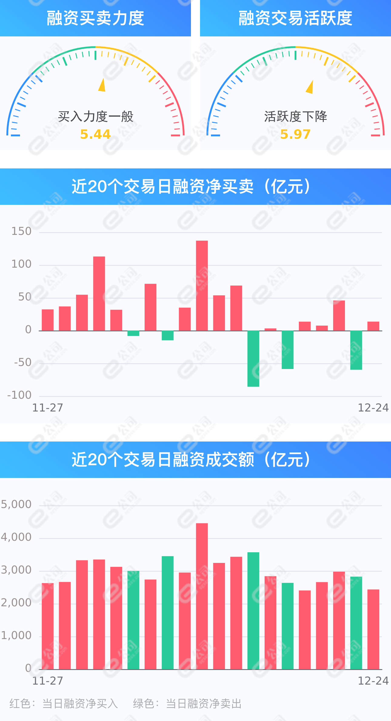 e公司讯,截至12月24日,上交所融资余额报9568.00亿元,较前一交易日增加6.55亿元;深交所融资余额报9096.73亿元,较前一交易日增加6.94亿元;两市合计18664.73亿元,较前一交易日增加13.49亿元,融资交易额2430.34亿元,占A股成交额18.59%,其中融资买入额1221.92亿元,融资偿还额1208.43亿元,交易活跃度下降13.87%。
