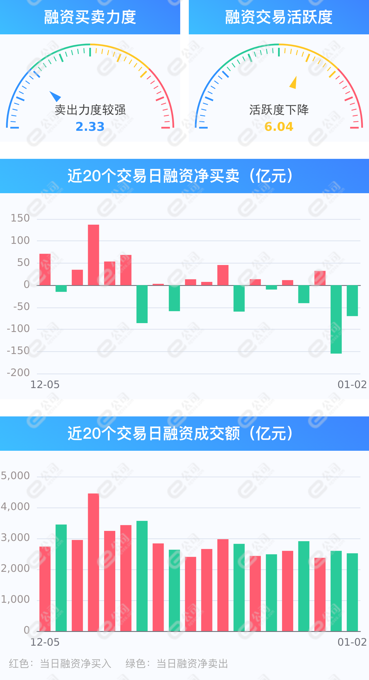 e公司讯,截至1月2日,上交所融资余额报9480.29亿元,较前一交易日减少14.76亿元;深交所融资余额报8952.60亿元,较前一交易日减少55.32亿元;两市合计18432.88亿元,较前一交易日减少70.07亿元,融资交易额2515.93亿元,占A股成交额18.02%,其中融资买入额1222.93亿元,融资偿还额1293.00亿元,交易活跃度下降3.00%。(此稿由证券时报e公司写稿机器人“快手小e”完成。)