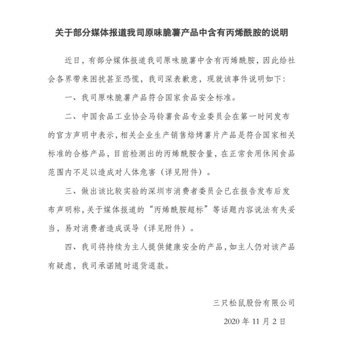 e公司讯,三只松鼠在e公司资本圈发布声明,公司原味脆薯产品符合国家食品安全标准。中国食品工业协会马铃薯食品专业委员会在第一时间发布的官方声明中表示,相关企业生产销售焙烤薯片产品是符合国家标准的合格产品,目前检测出的丙烯酰胺含量,在正常食用休闲产品范围内不足以造成对人体危害。做出该比较试验的深圳市消费者委员会已在报告发布后发布声明称,关于媒体报道的“丙烯酰胺超标”等话题内容说法有失妥当,易对消费者造成误导。