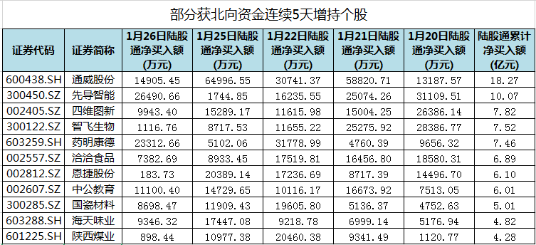 e公司讯,据同花顺iFinD统计,近5个交易日(1月20日-1月26日)88股获北向资金连续5天增持。获北向资金连续增持前5名的个股分别是通威股份、先导智能、四维图新、智飞生物、药明康德。5天累计净买入金额在5000万元以上的有57只,其中25只累计净买入额超2亿元。通威股份获北向资金5天累计净买入约18.27亿元,位居连续增持榜首。