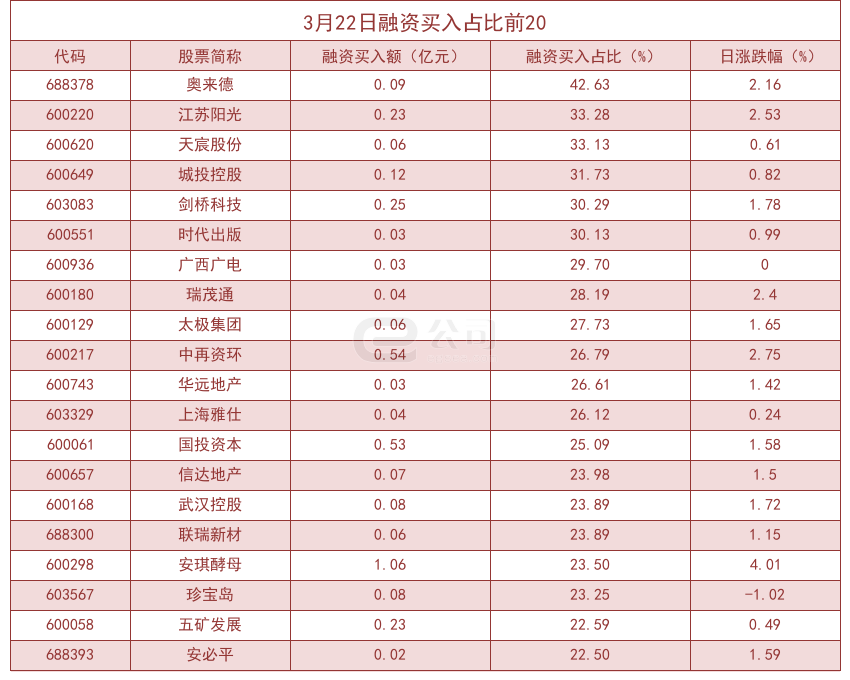 个股方面,沪深两市共有1039只个股有融资资金买入。从融资买入额占当日总成交金额比重来看,共有42只股票融资买入额占比超20%,其中奥来德(42.63%)、江苏阳光(33.28%)、天宸股份(33.13%)排名前三。
