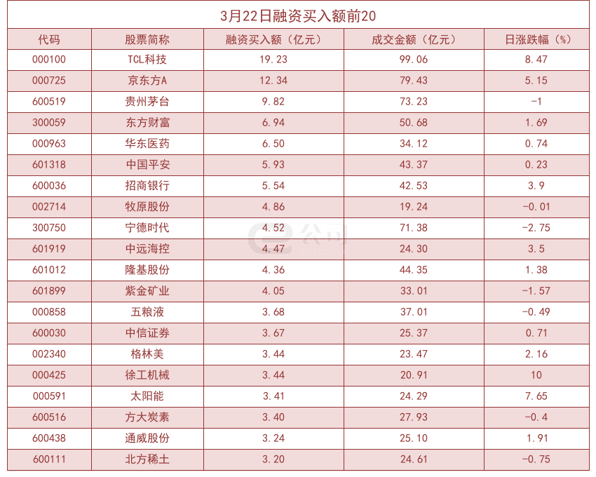 从融资资金买入金额来看,共有114只个股买入金额超亿元,其中TCL科技(19.23亿元)、京东方A(12.34亿元)、贵州茅台(9.82亿元)居前三位。